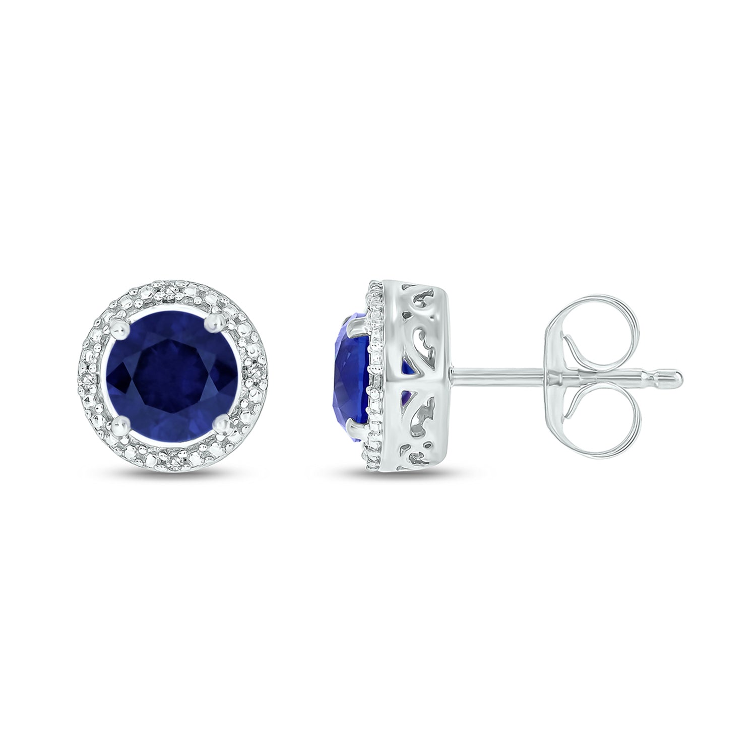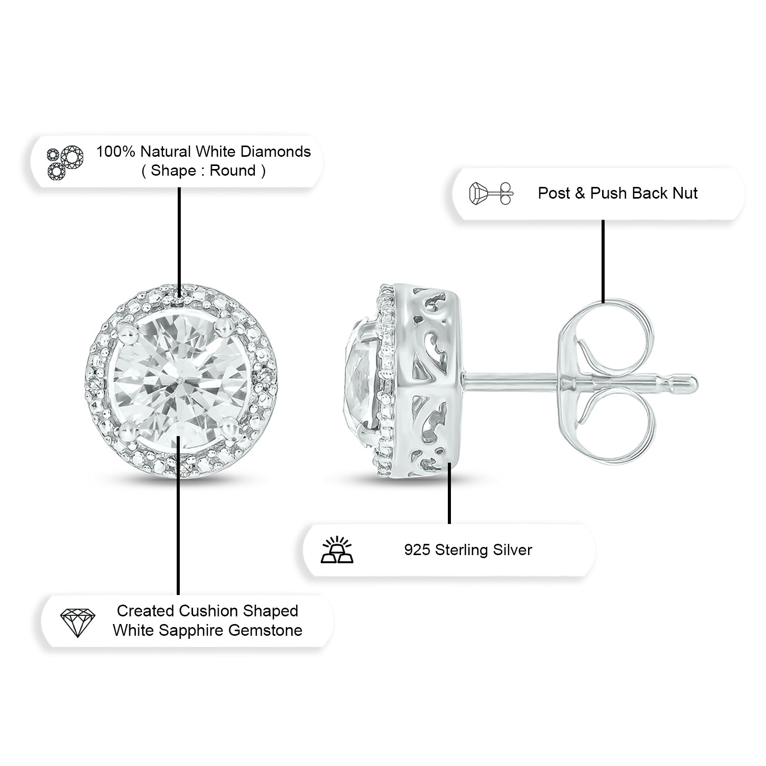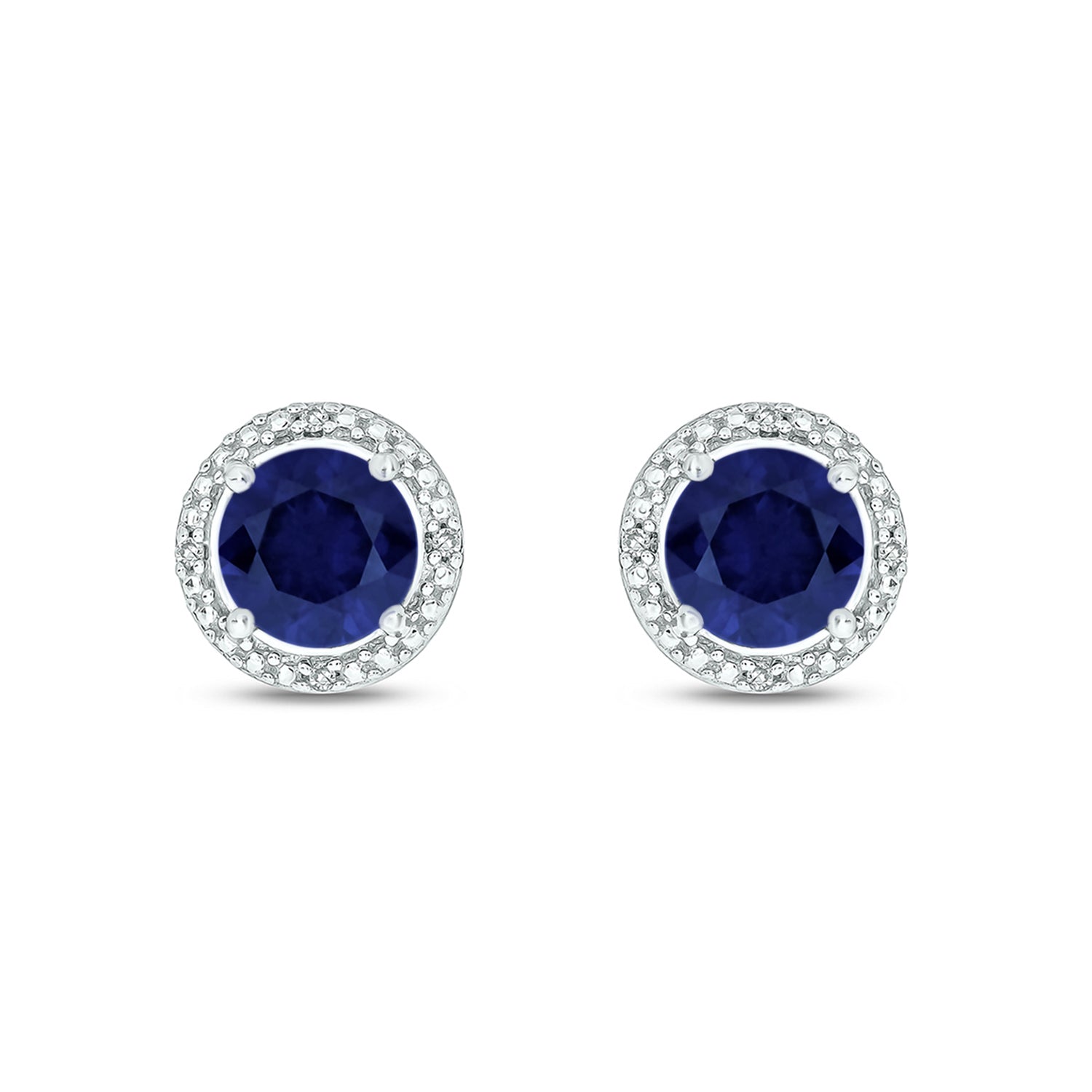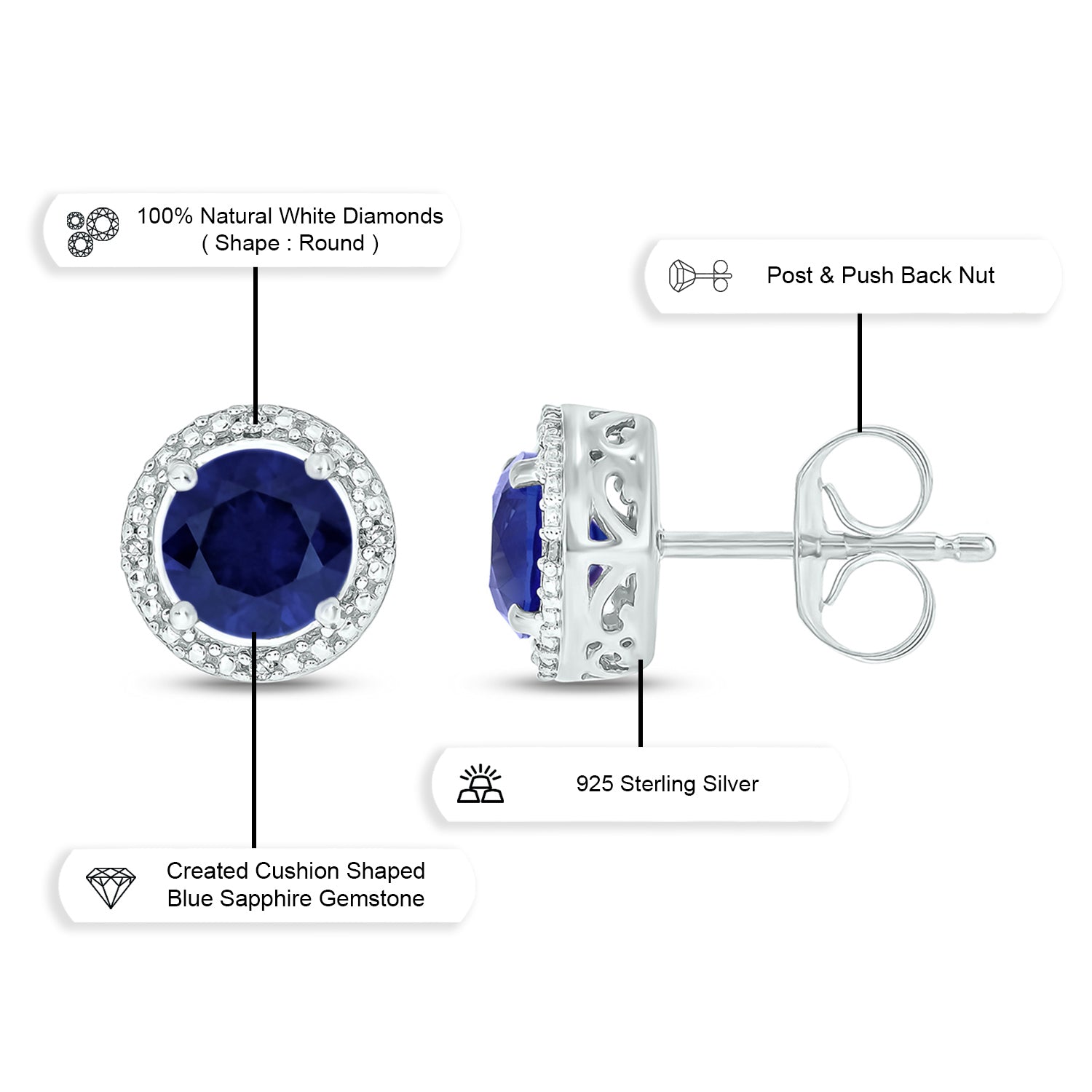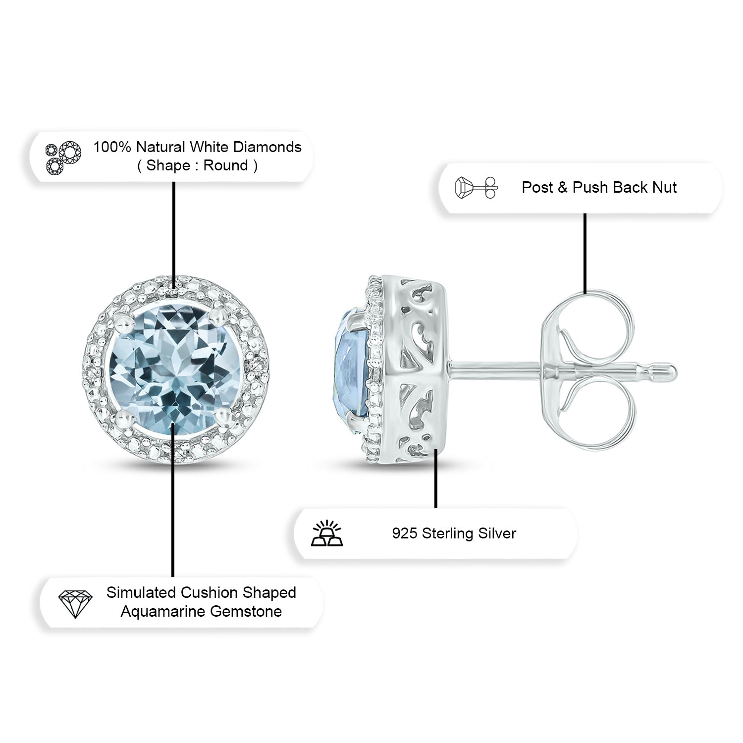 Beautifully crafted in 18K - 1 micron gold plated 925 sterling silver, this classic & chic pair of earrings are composed of created round shaped gemstones surrounded by 1/20ct natural round diamonds having the earing back as post & push-back. Also available in white sapphire, blue sapphire, Aquamarine, Ruby, Emerald