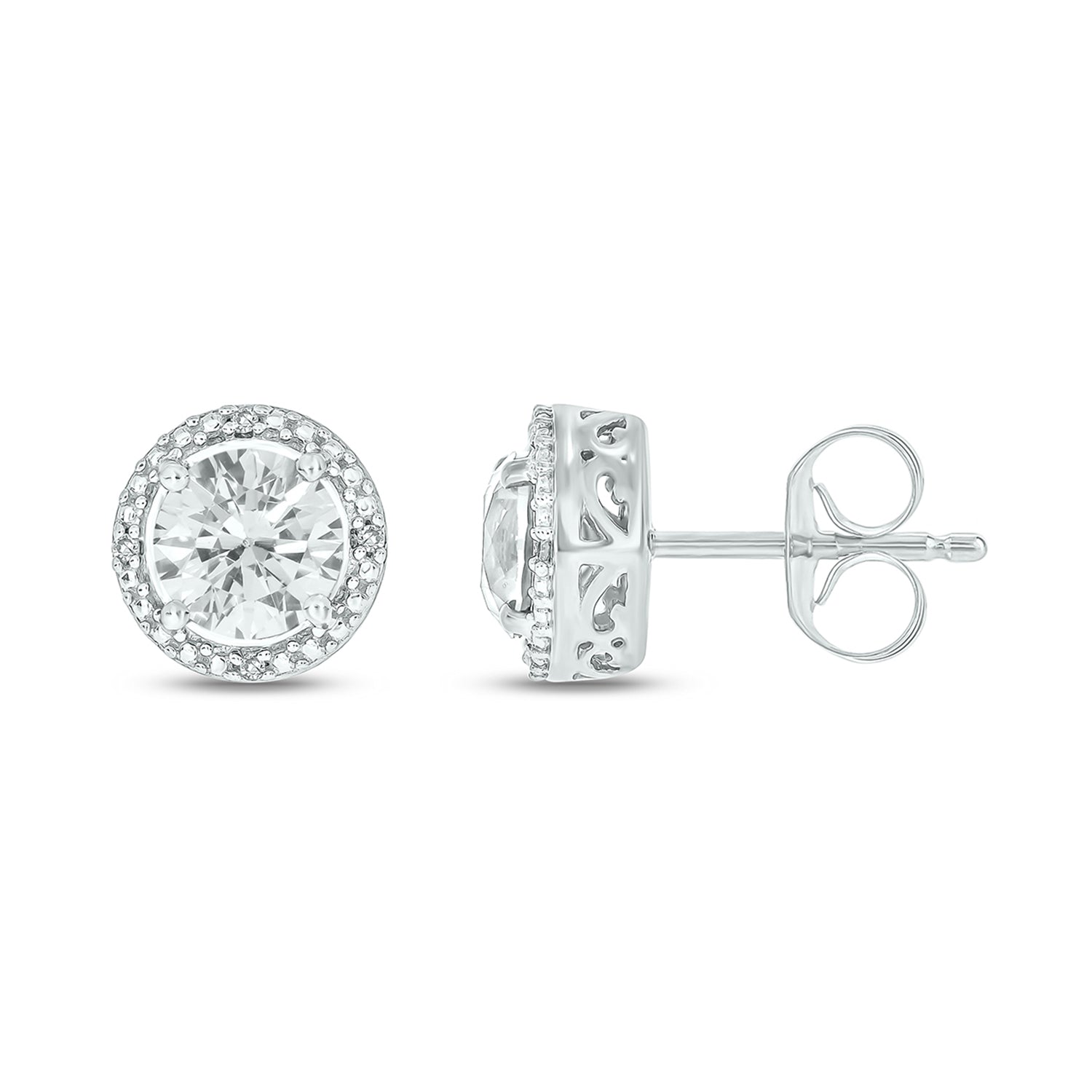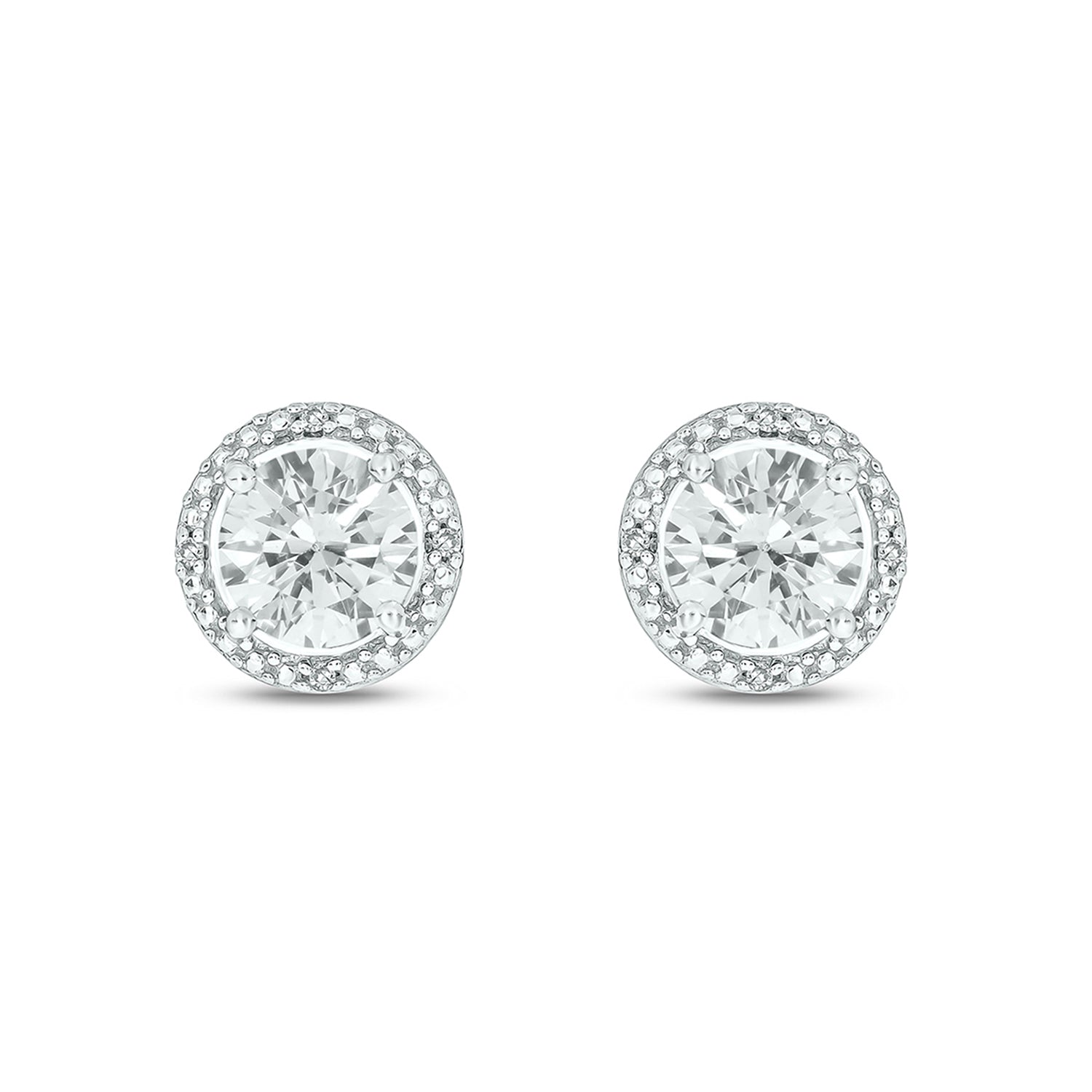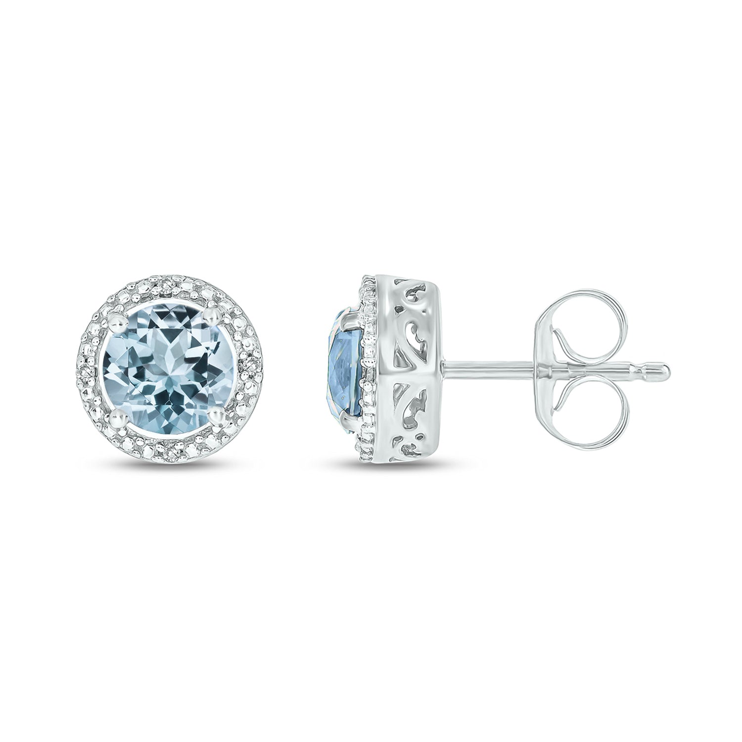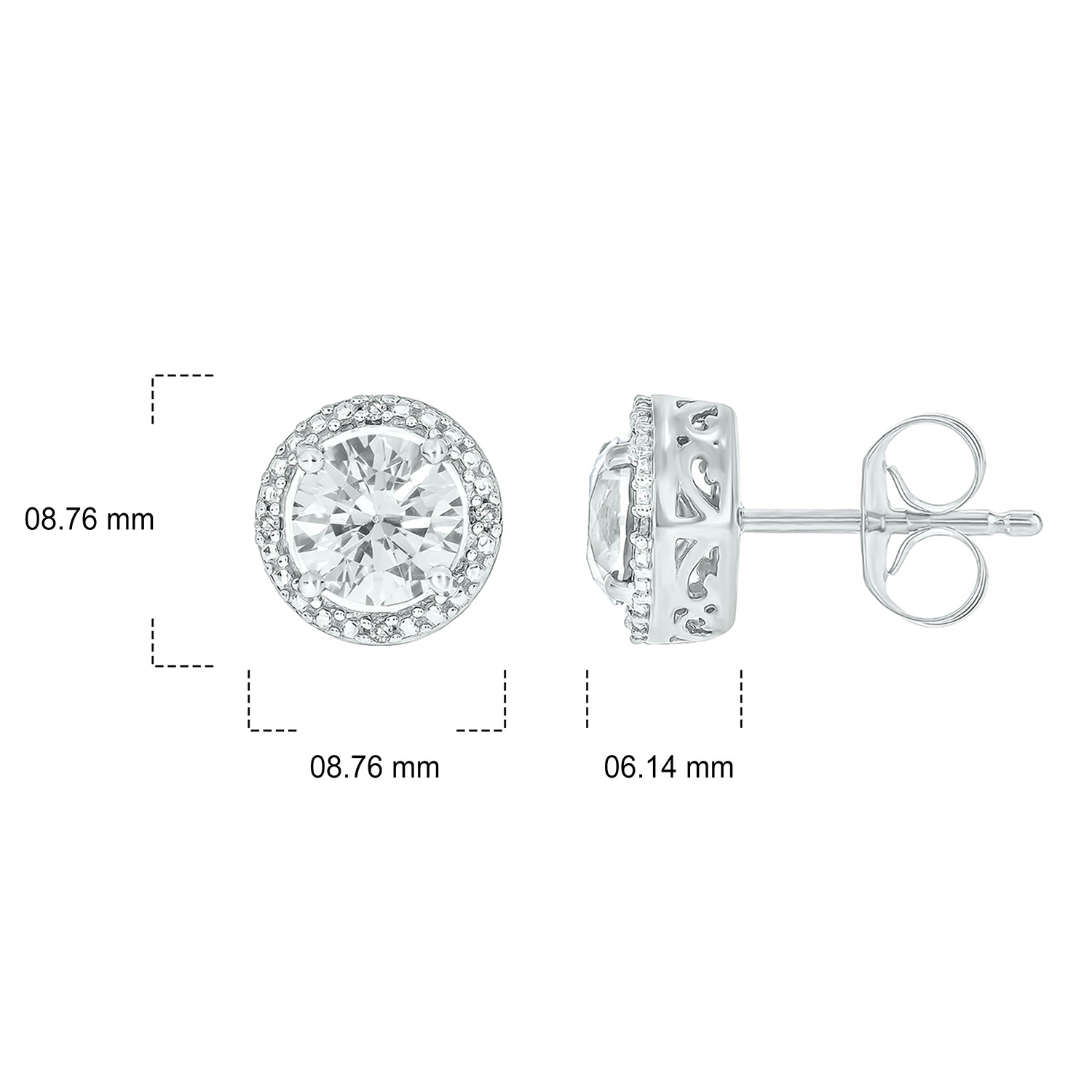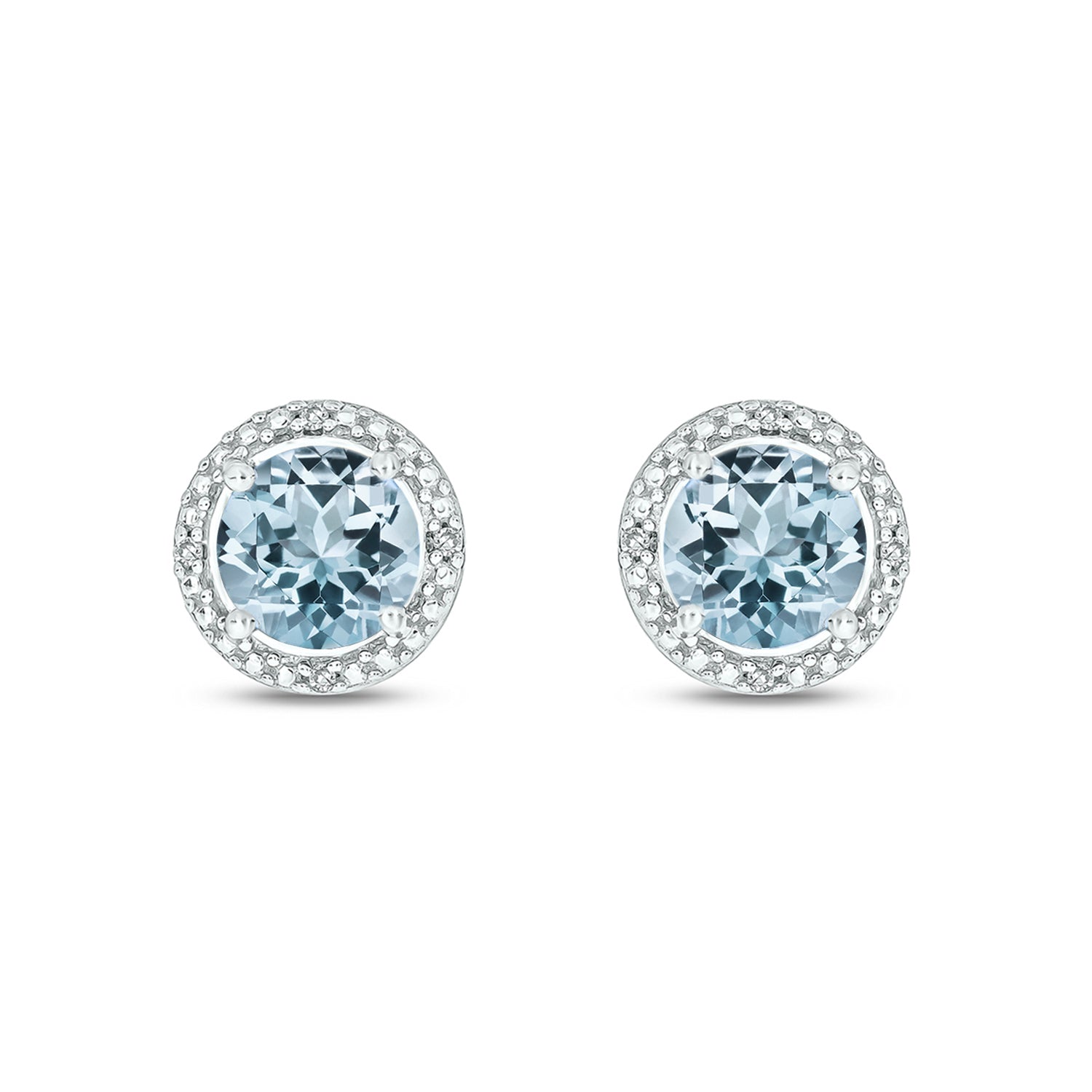 Beautifully crafted in 18K - 1 micron gold plated 925 sterling silver, this classic & chic pair of earrings are composed of created round shaped gemstones surrounded by 1/20ct natural round diamonds having the earing back as post & push-back. Also available in white sapphire, blue sapphire, Aquamarine, Ruby, Emerald