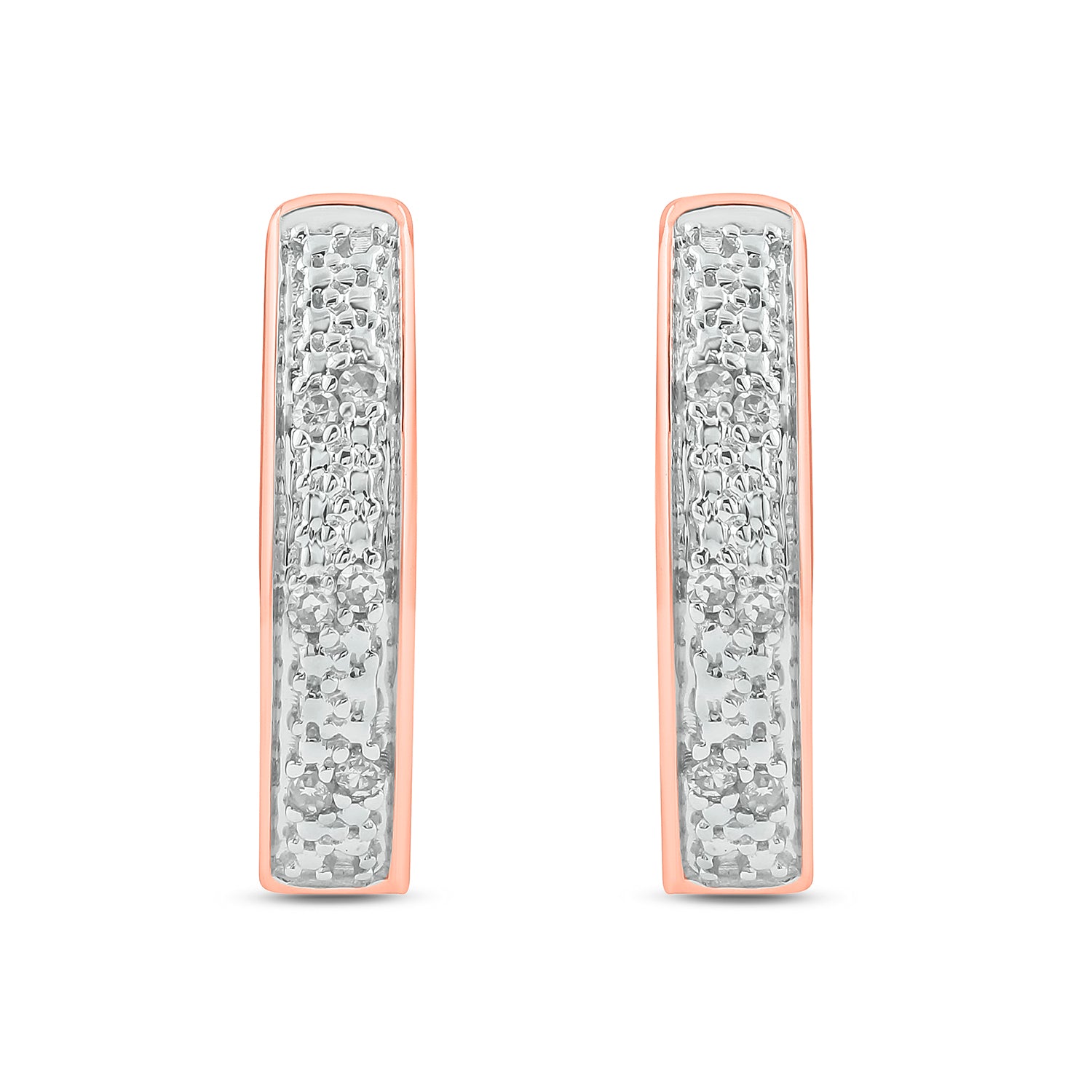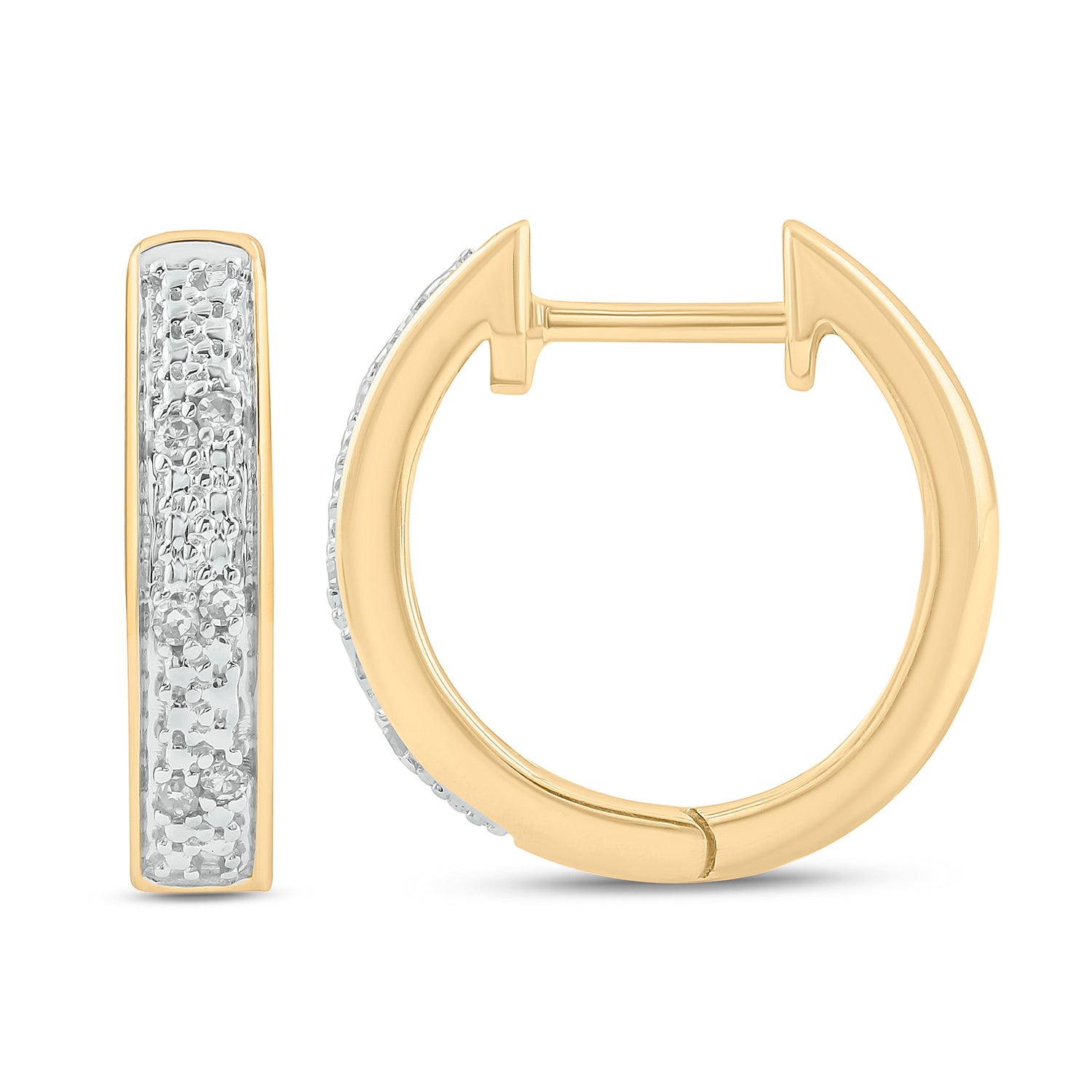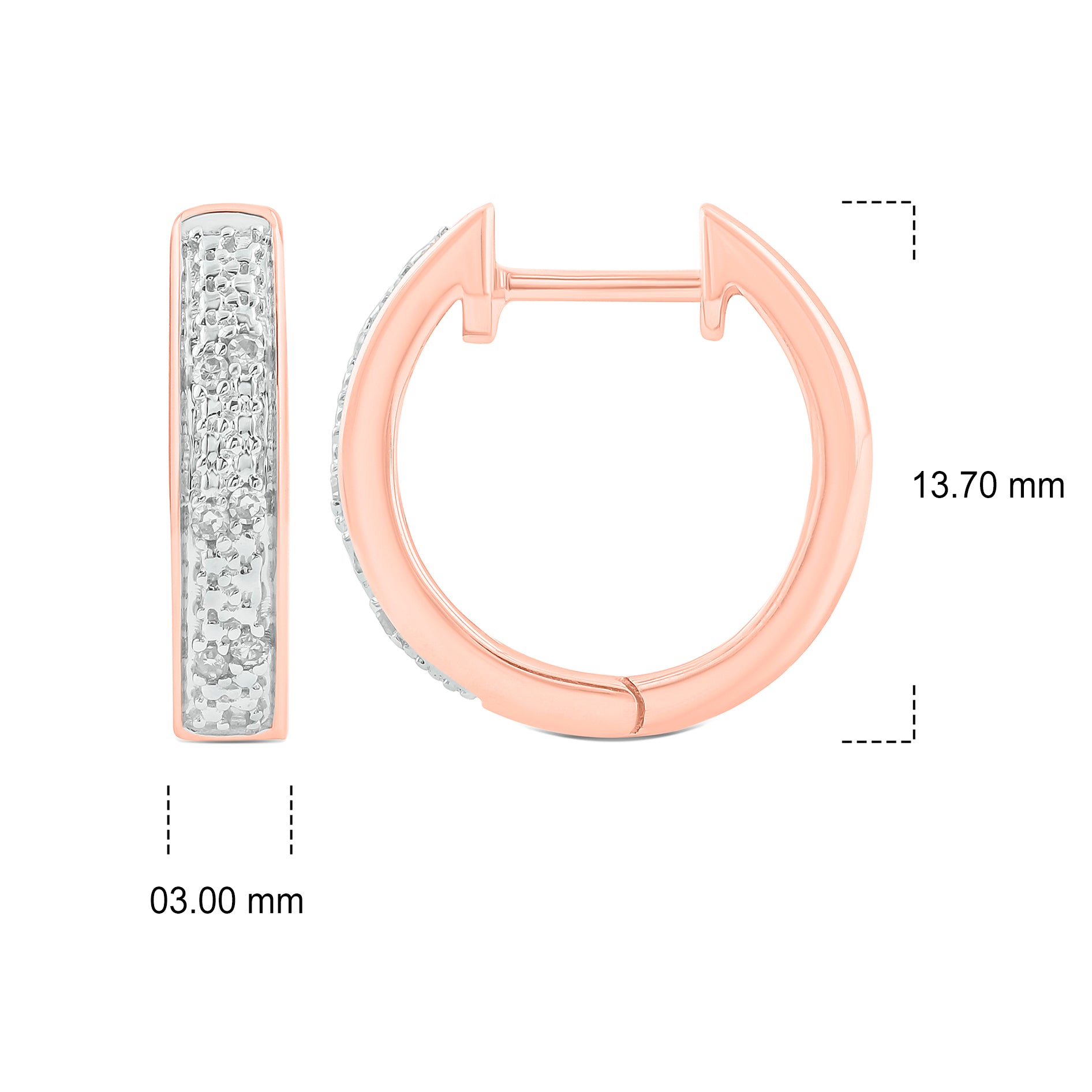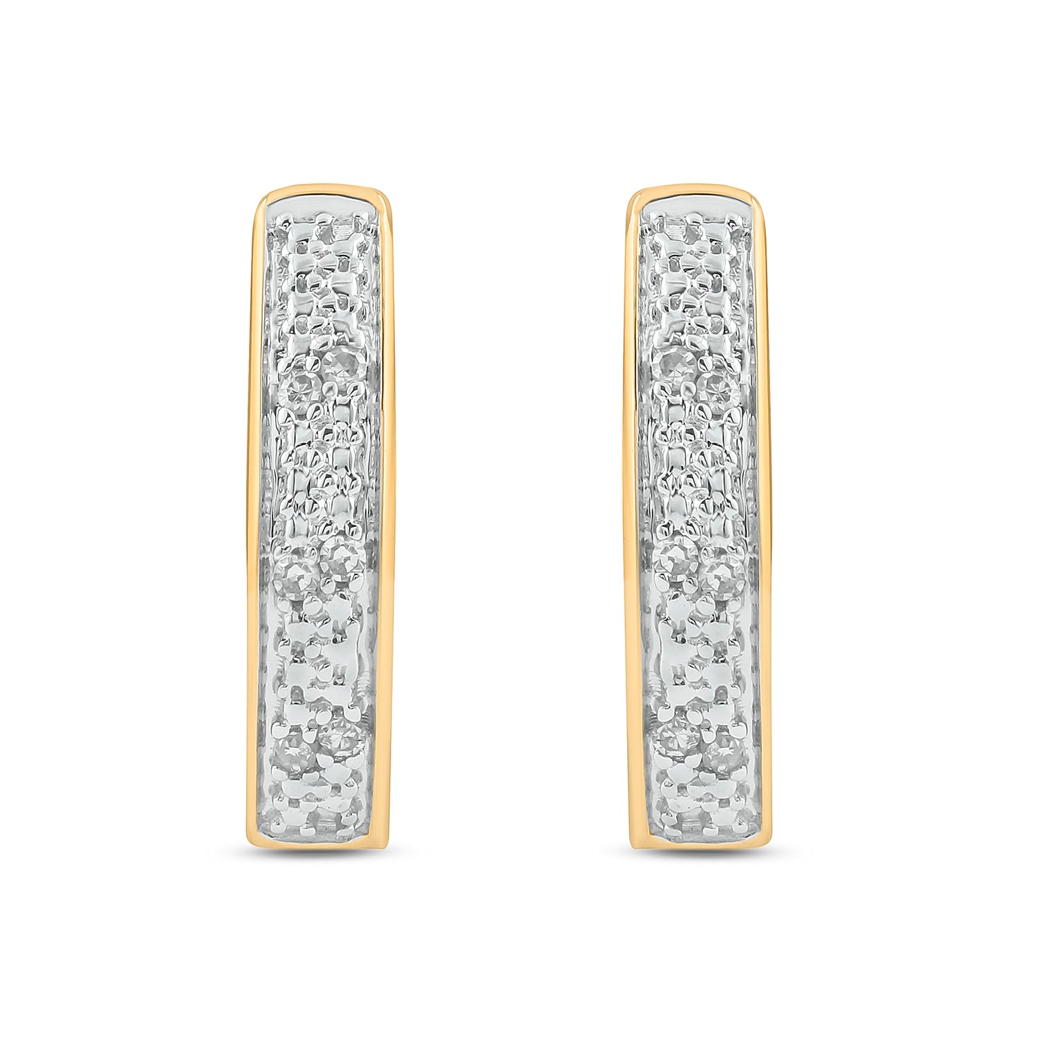 • These elegant Hoop Huggie Earrings are crafted in 925 Sterling Silver and adorned with 1/20 carat of natural round diamonds- available in 14KT Yellow Gold Vermeil and 18KT Rose Gold Vermeil. These diamond hoops have a secure latch-back closure providing a safe & comfortable fit.