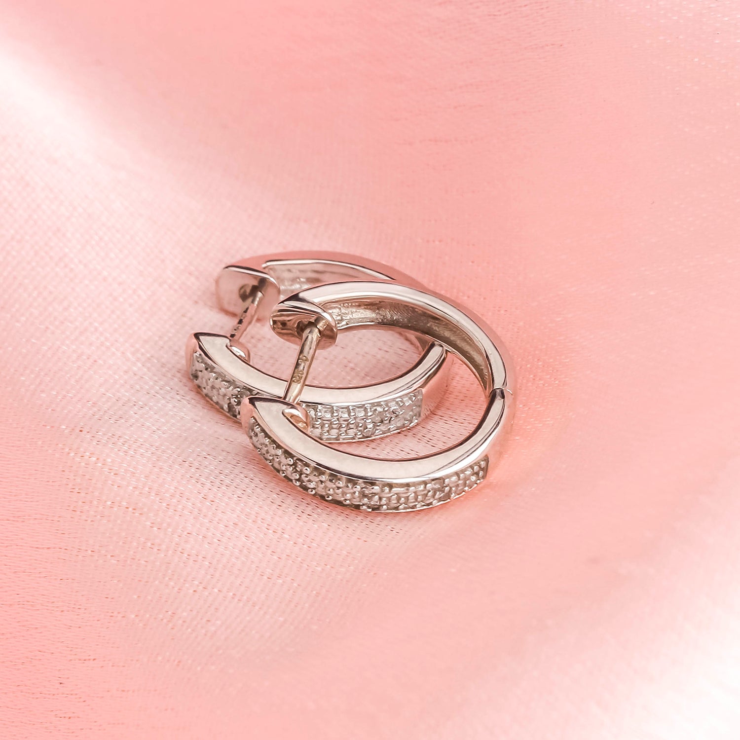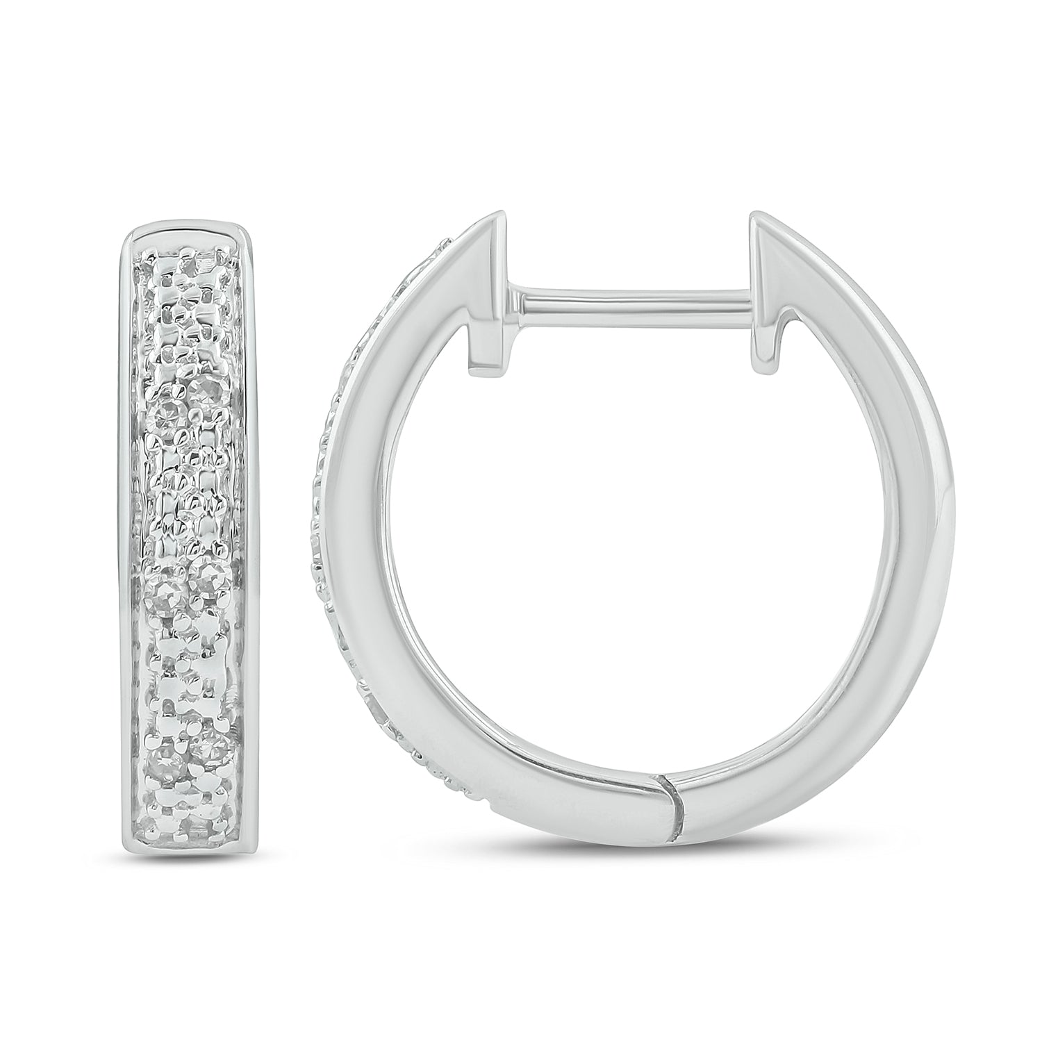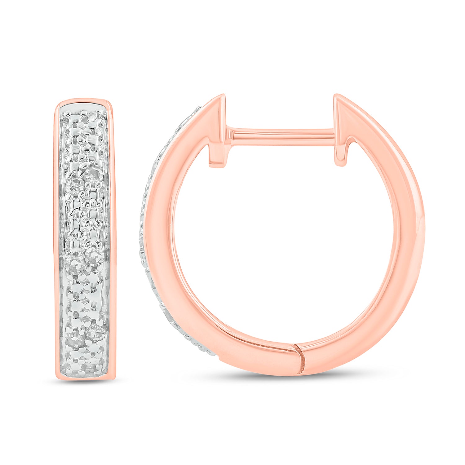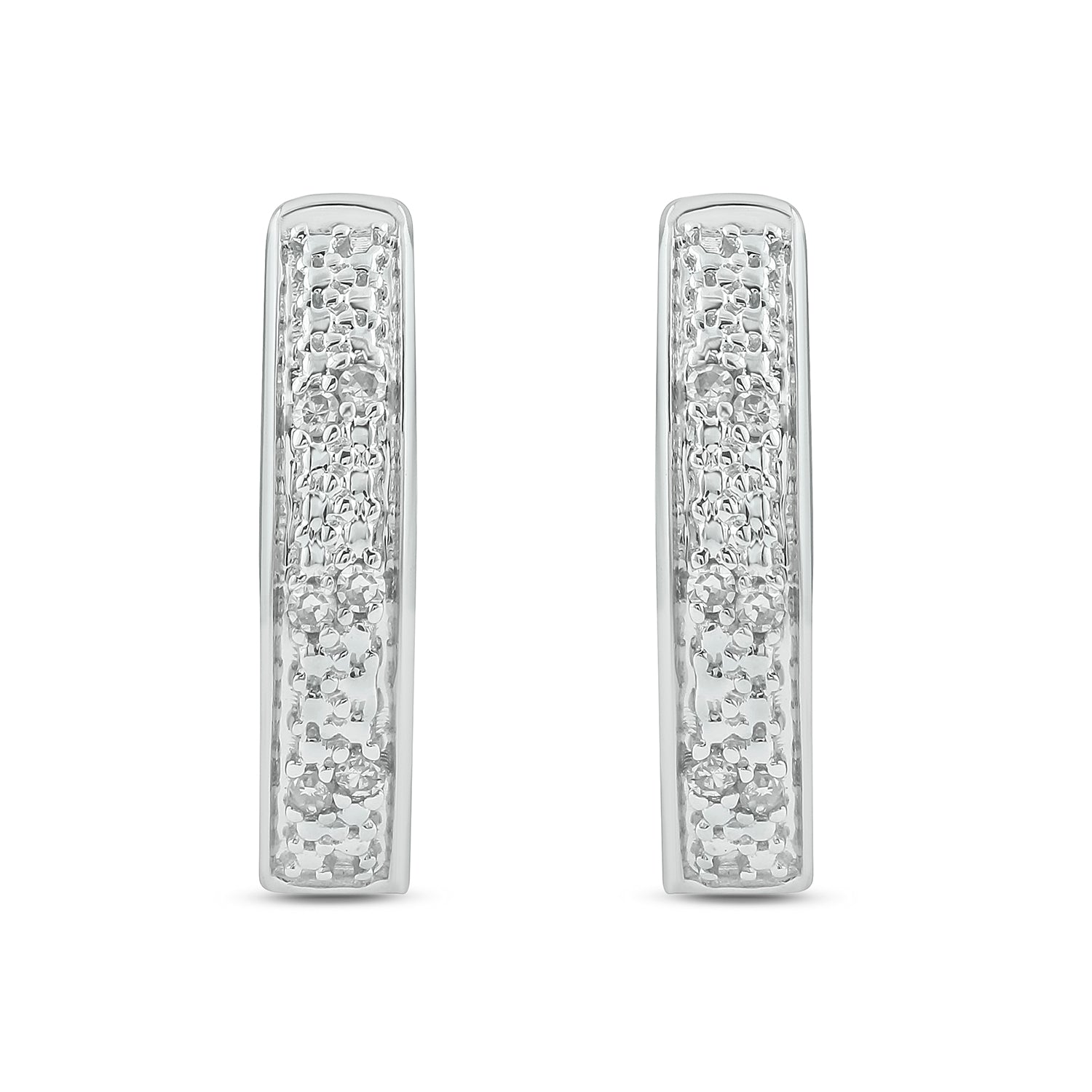 • These elegant Hoop Huggie Earrings are crafted in 925 Sterling Silver and adorned with 1/20 carat of natural round diamonds- available in 14KT Yellow Gold Vermeil and 18KT Rose Gold Vermeil. These diamond hoops have a secure latch-back closure providing a safe & comfortable fit.