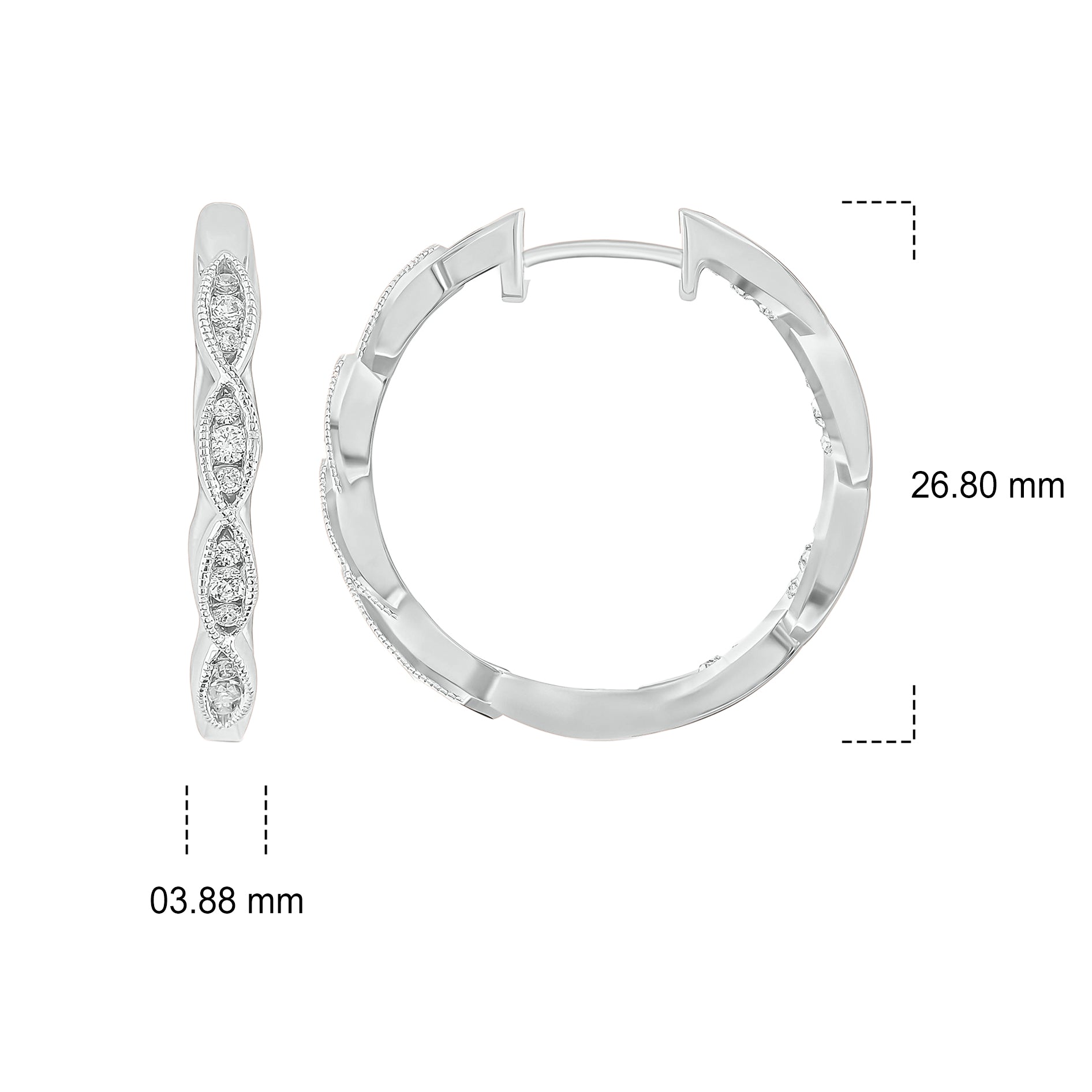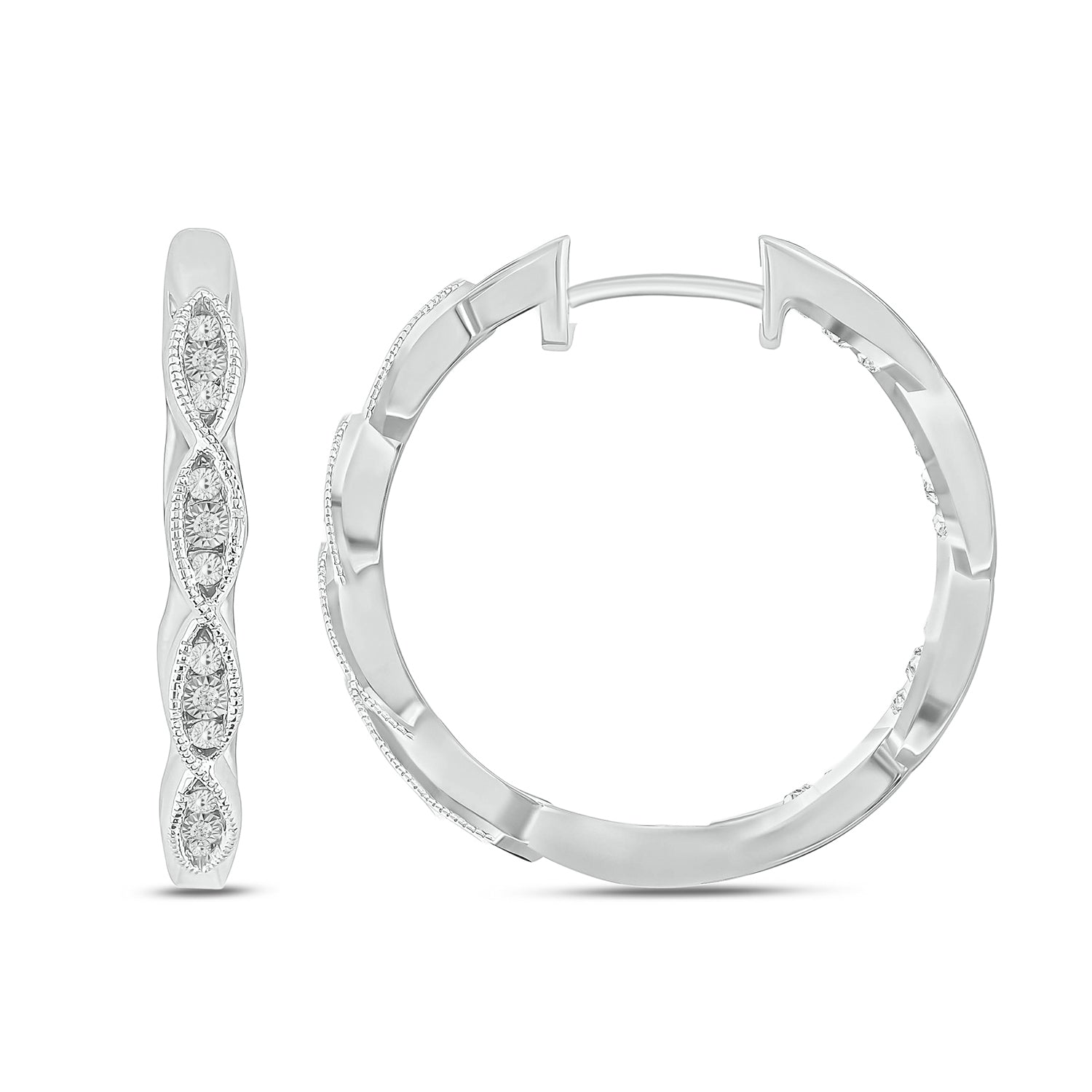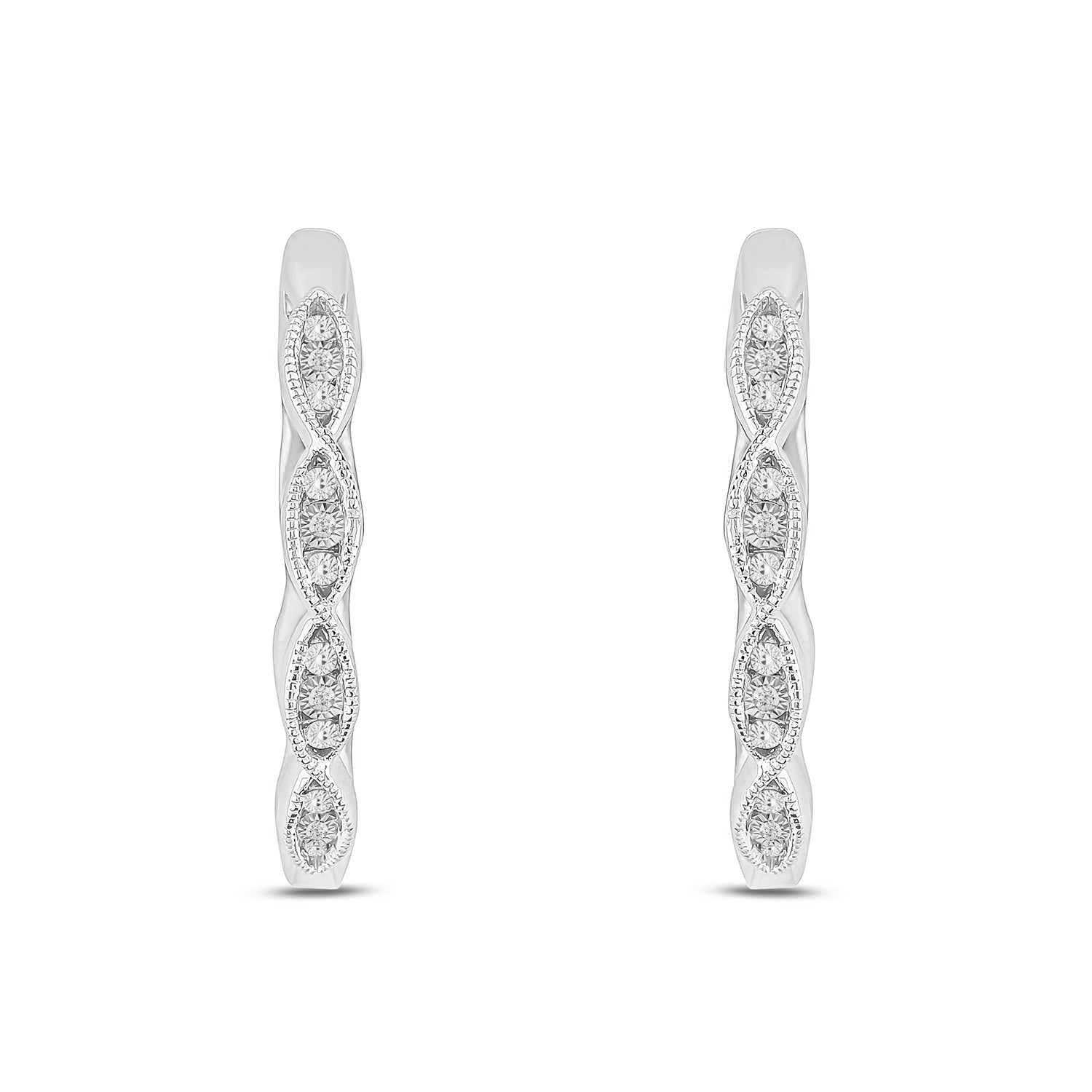 • These 925 Sterling Silver hoops earrings offer a modern, minimalist aesthetic. They are adorned with 1/20 carat of natural round diamonds, also available in 14KT Yellow Gold Vermeil and 18KT Rose Gold Vermeil. These diamond hoops have a secure latch-back closure providing comfortable fit.