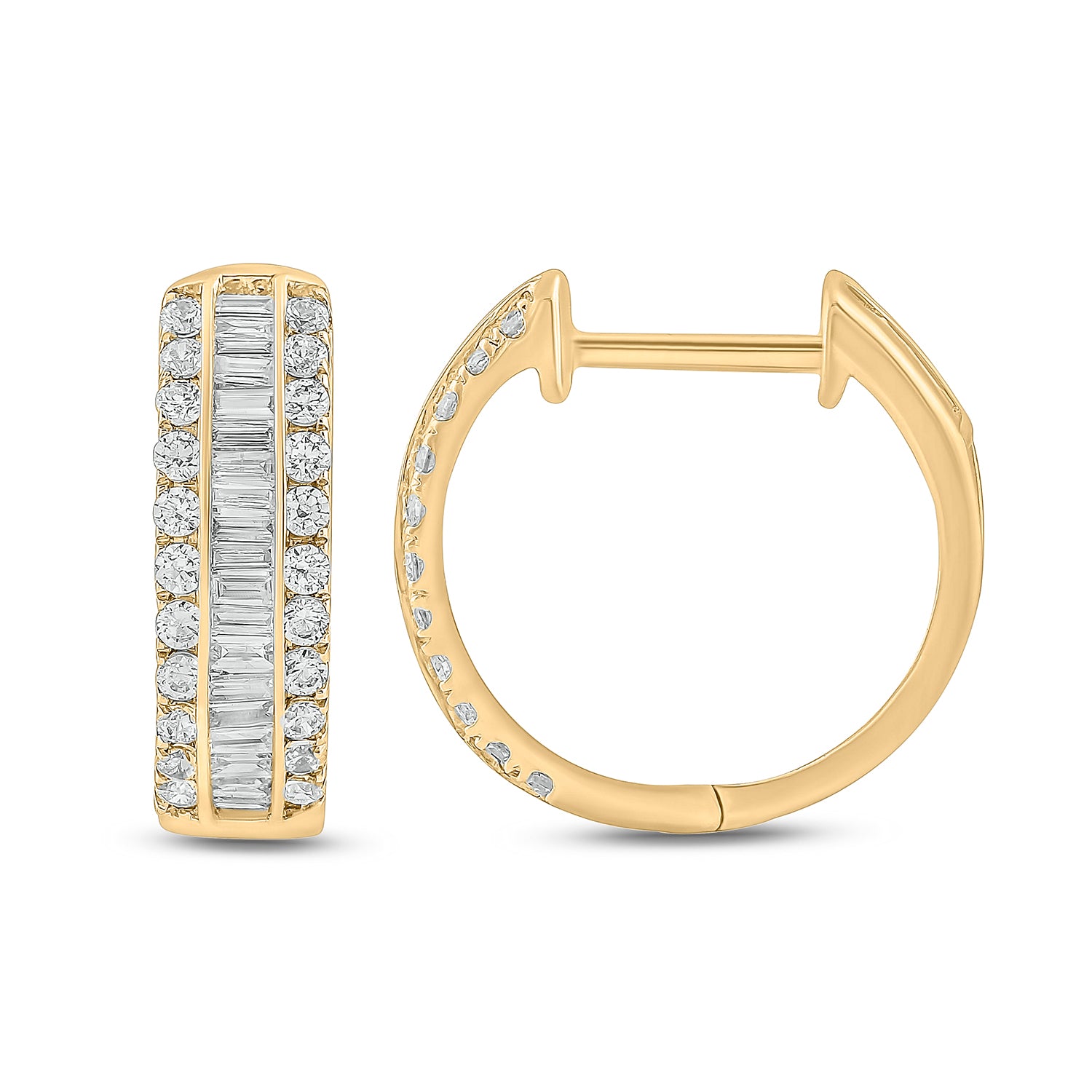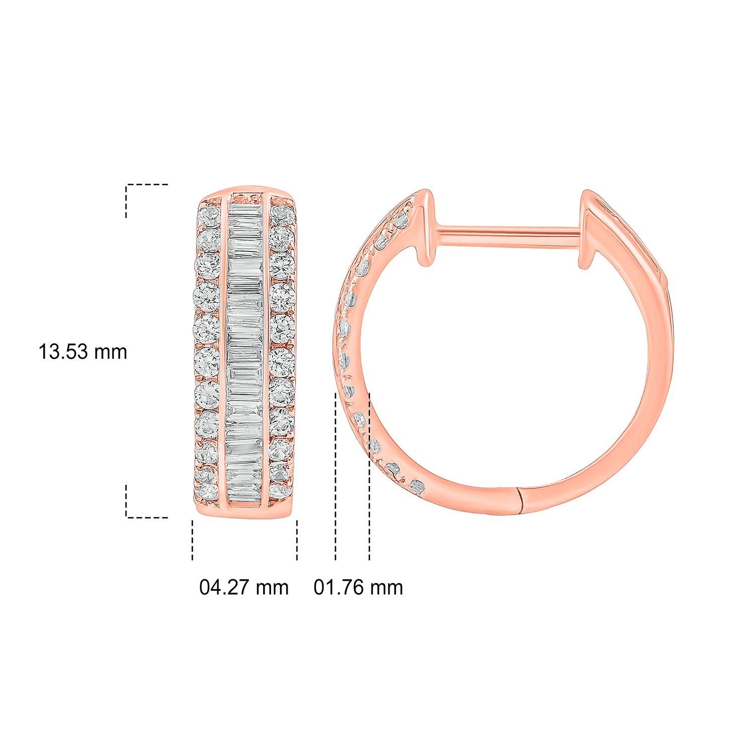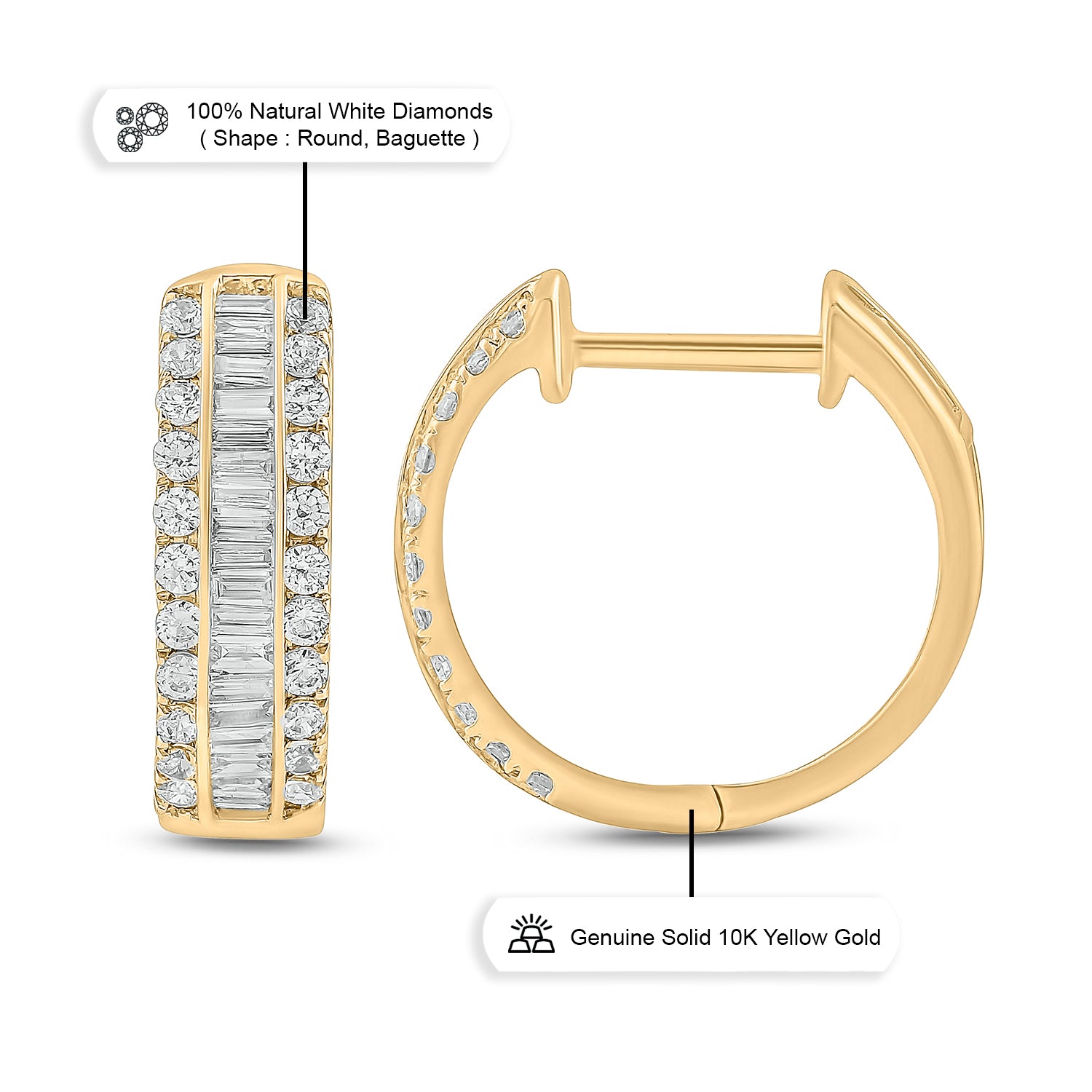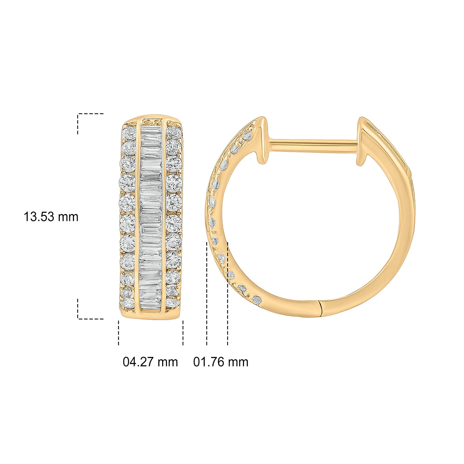 Unveiling a mini dainty masterpiece, these hoop earrings are crafted exclusively in 10kt gold featuring 1/2 ct natural round & baguette diamonds with a hinge back closure. Available in metal colors of your choice - White Gold, Yellow Gold & Rose Gold