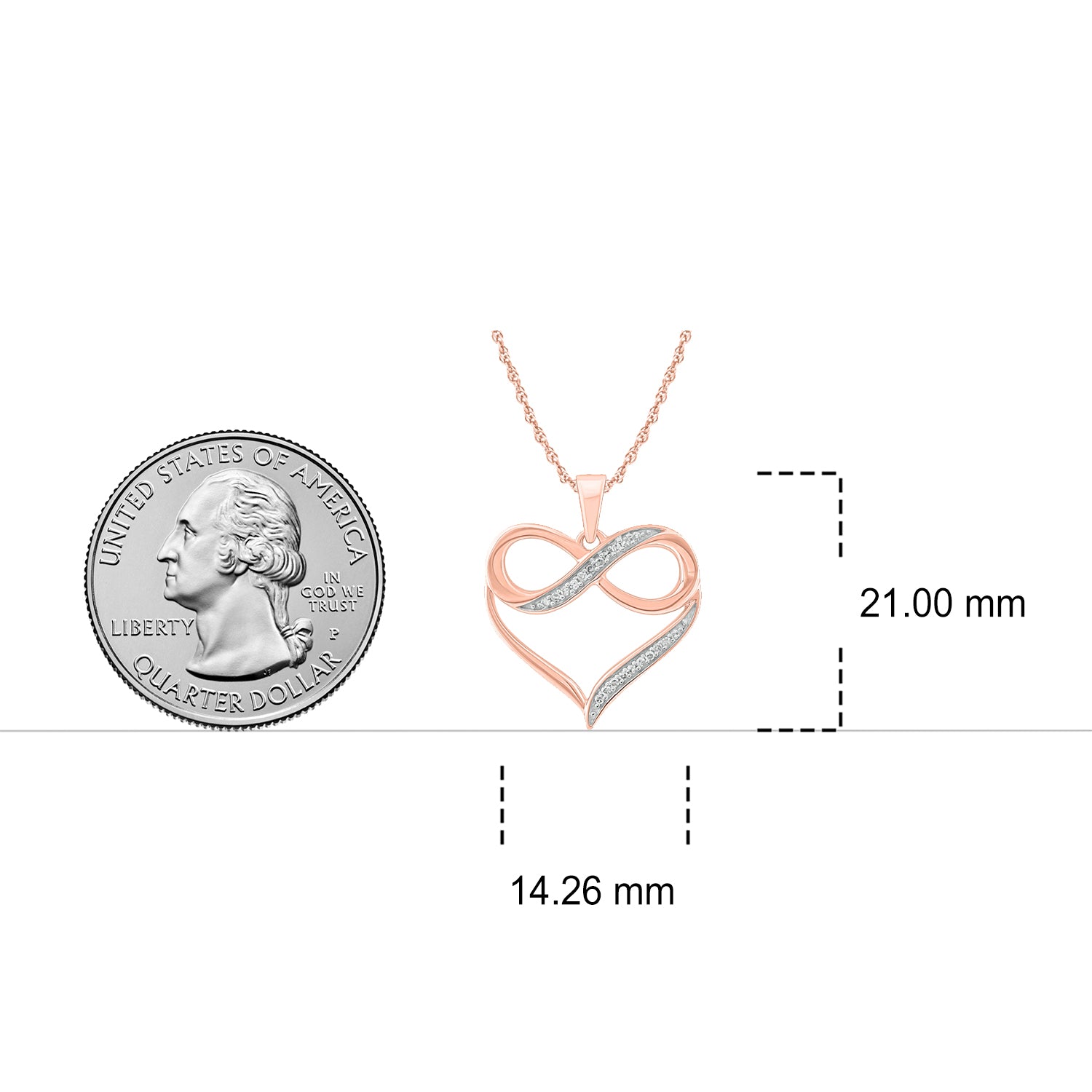 This stunning infinity heart pendant necklace is exquisitely crafted in 10KT gold featuring 1/20ct of genuine natural round diamonds. It comes with an 18" rope chain with a spring-ring closure. Select the metal of your choice: Rose gold, white gold, or yellow gold