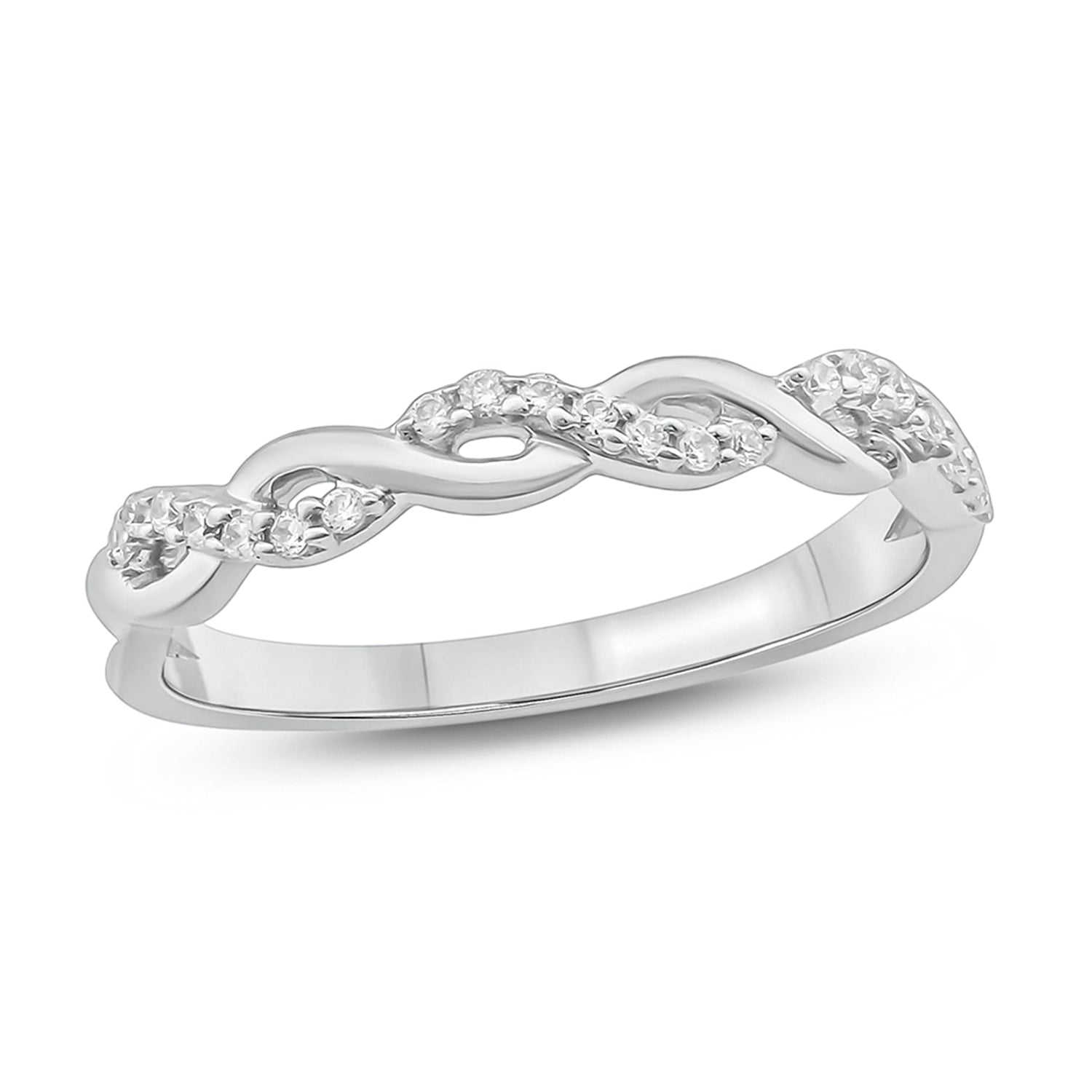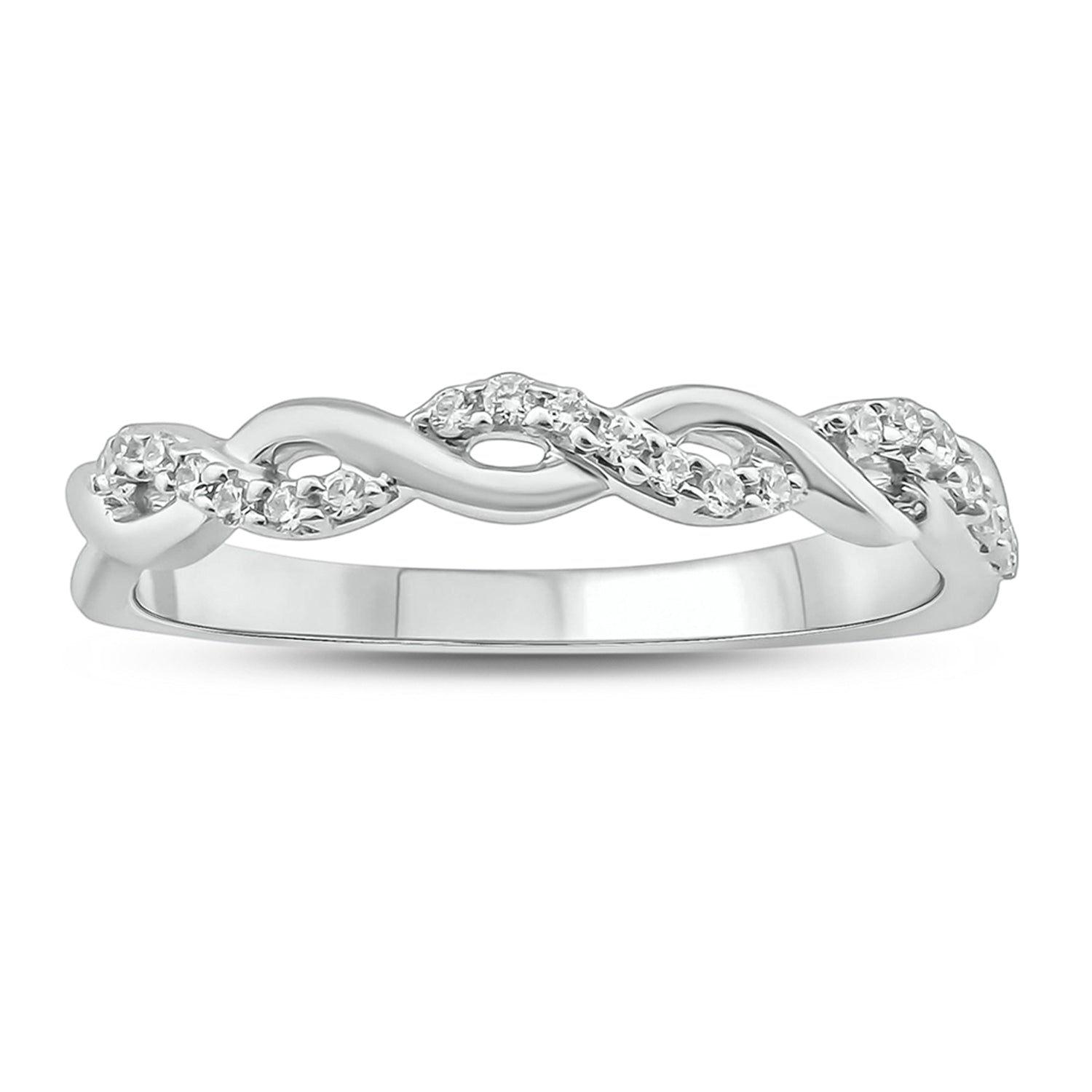 Exclusively crafted in 925 sterling silver, this swirl diamond stackable anniversary band features 1/10ct natural round diamonds. This band can be worn alone or can be paired with a matching engagement ring or stacked with other rings.