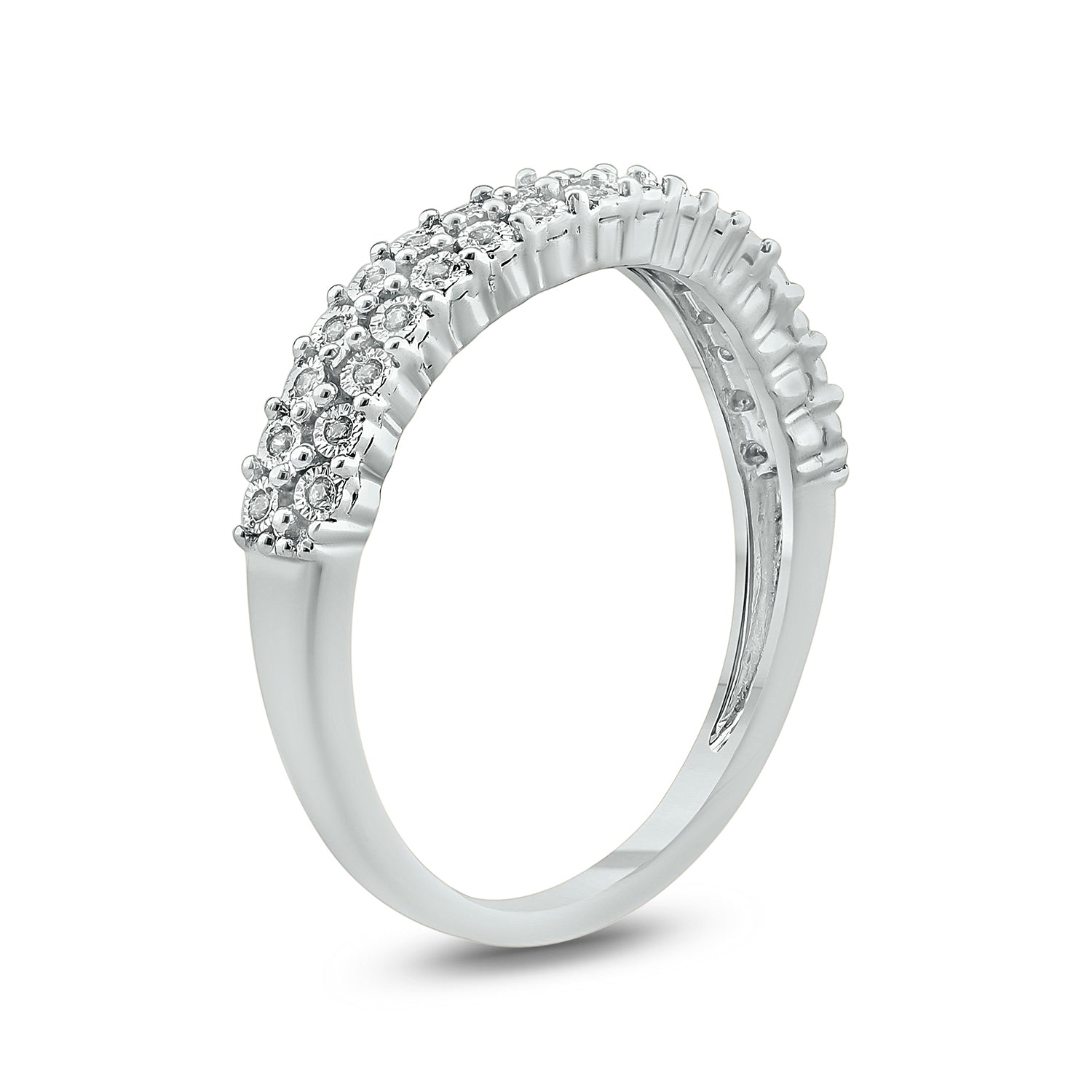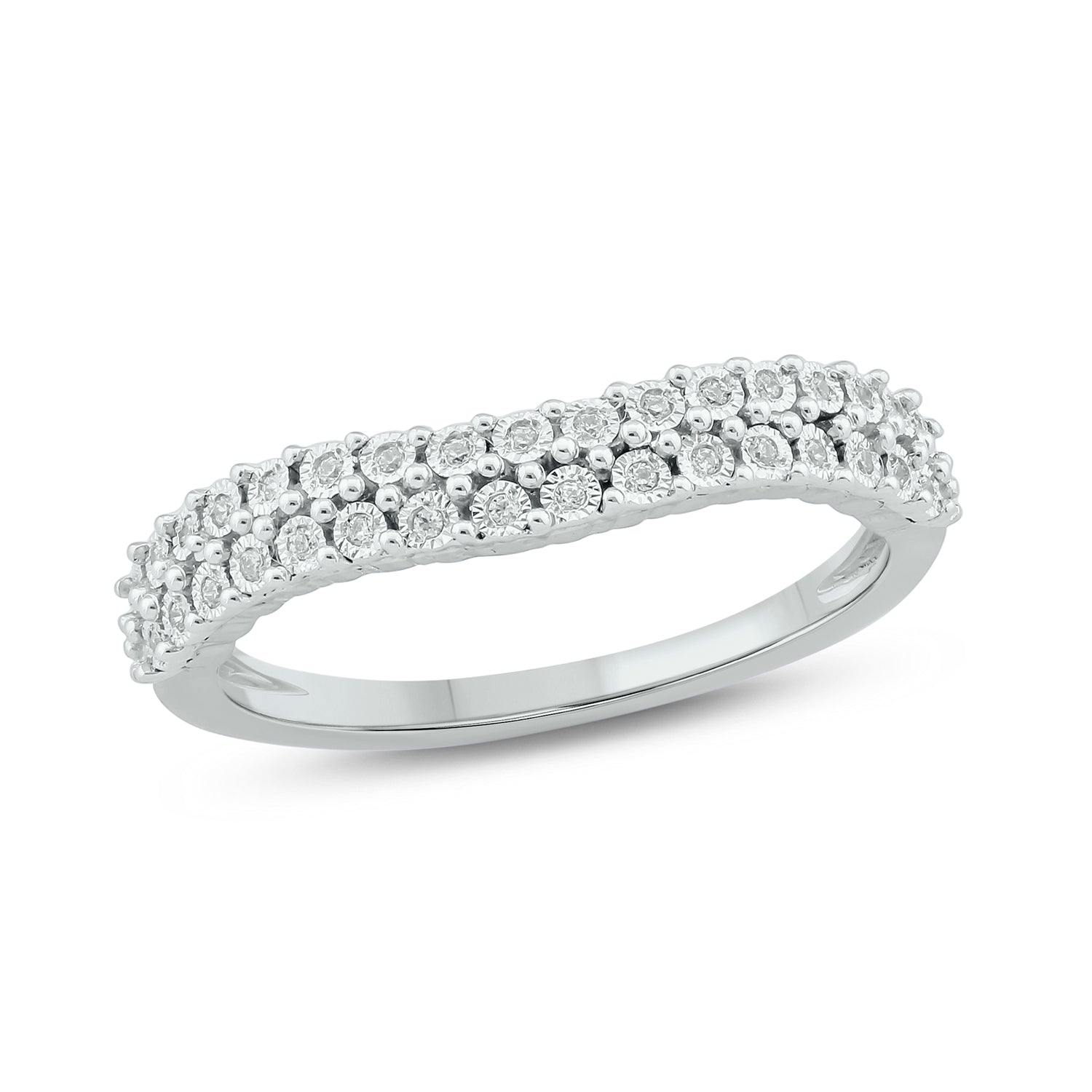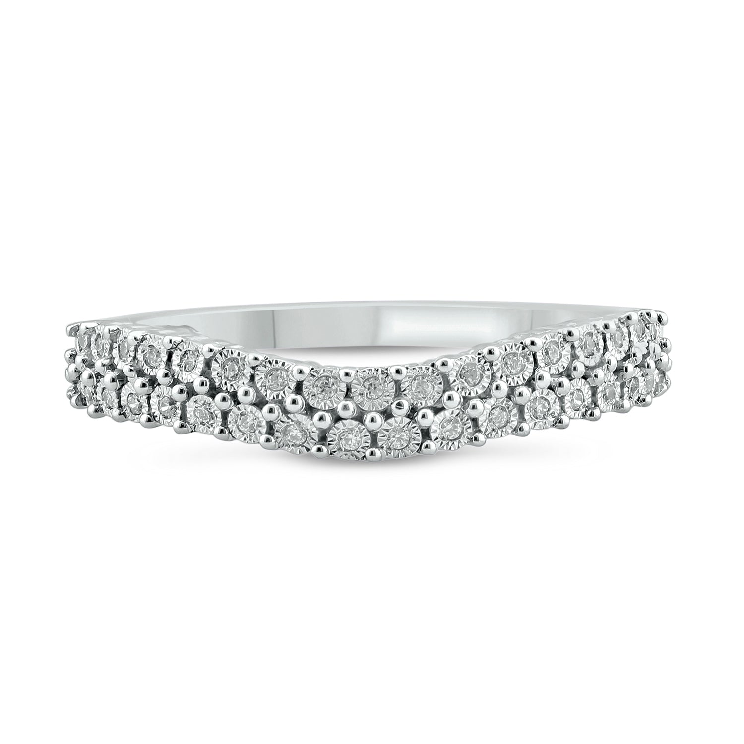 Exclusively crafted in 925 sterling silver, this double row contour diamond stackable anniversary band features 1/10ct natural round diamonds. This band can be worn alone or can be paired with a matching engagement ring or stacked with other rings.