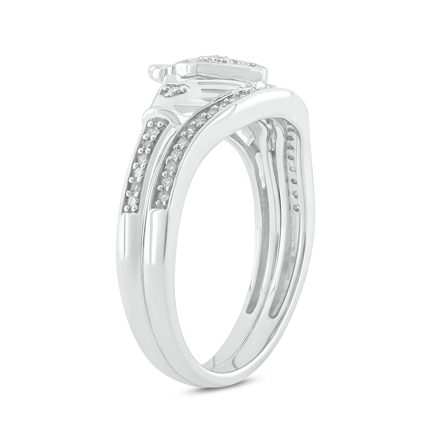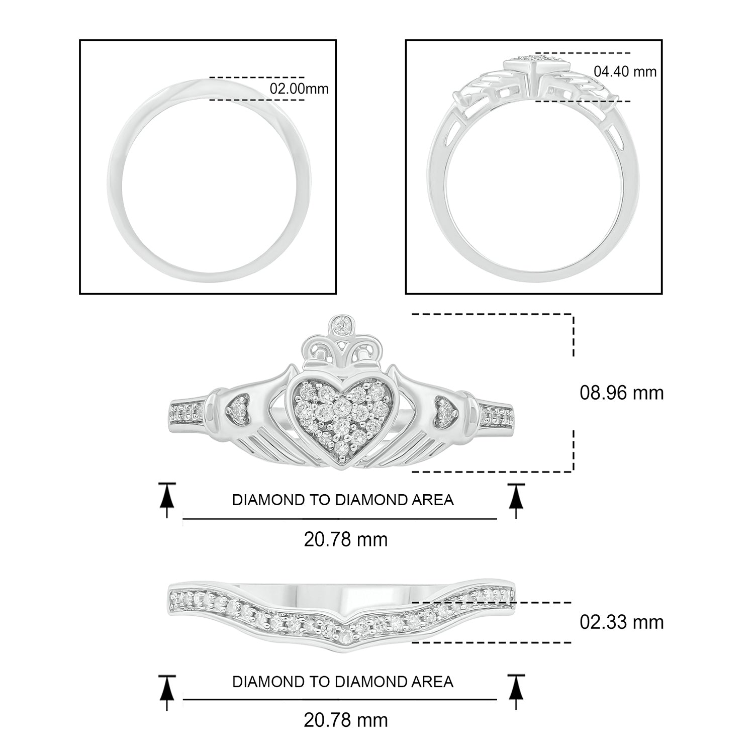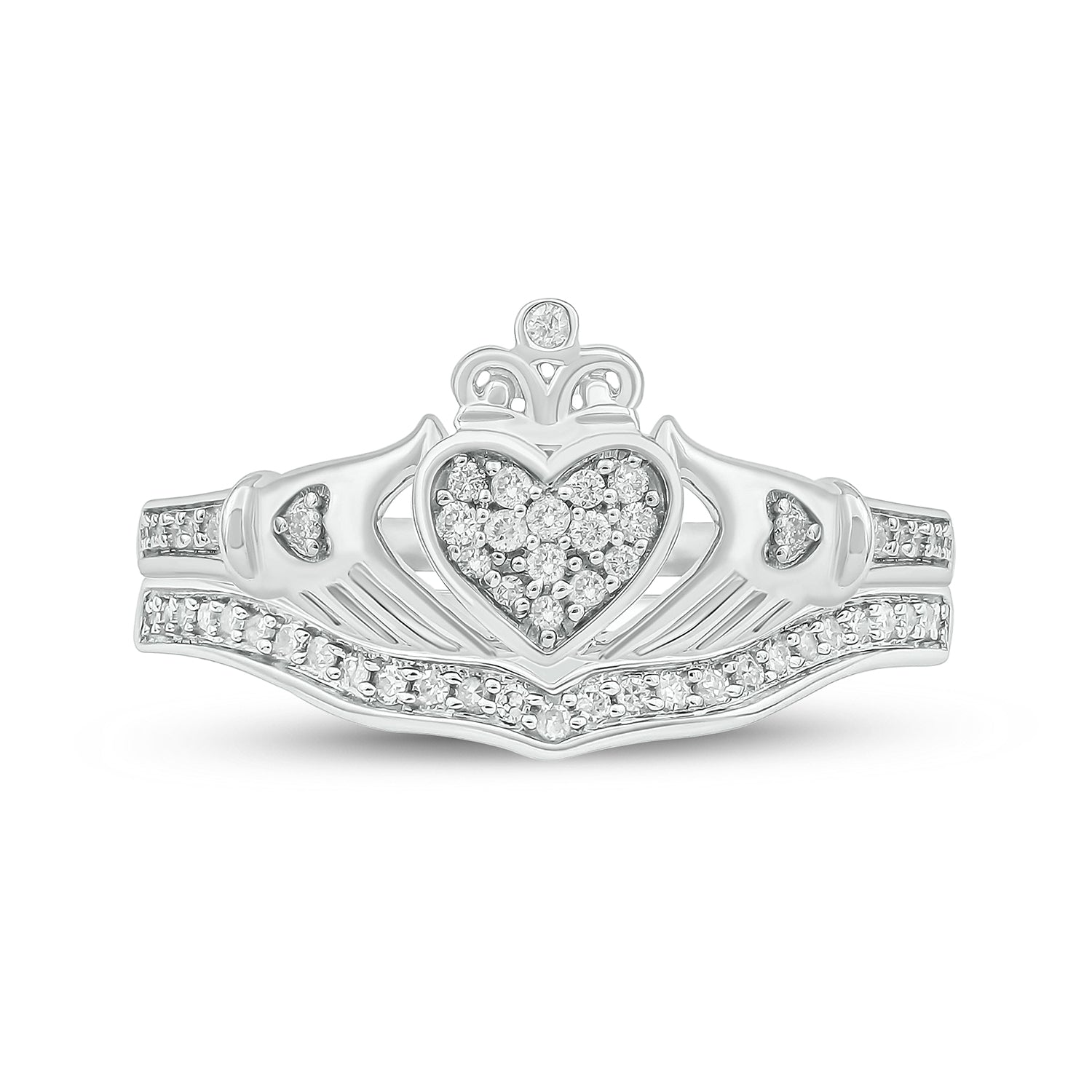 Crafted in 925 sterling silver this beautiful Irish Wedding Ring Set features 1/4ct natural round diamonds. The matching Wedding Band curves along the edge of the Claddagh Engagement Ring and is accented by pave-set diamonds.