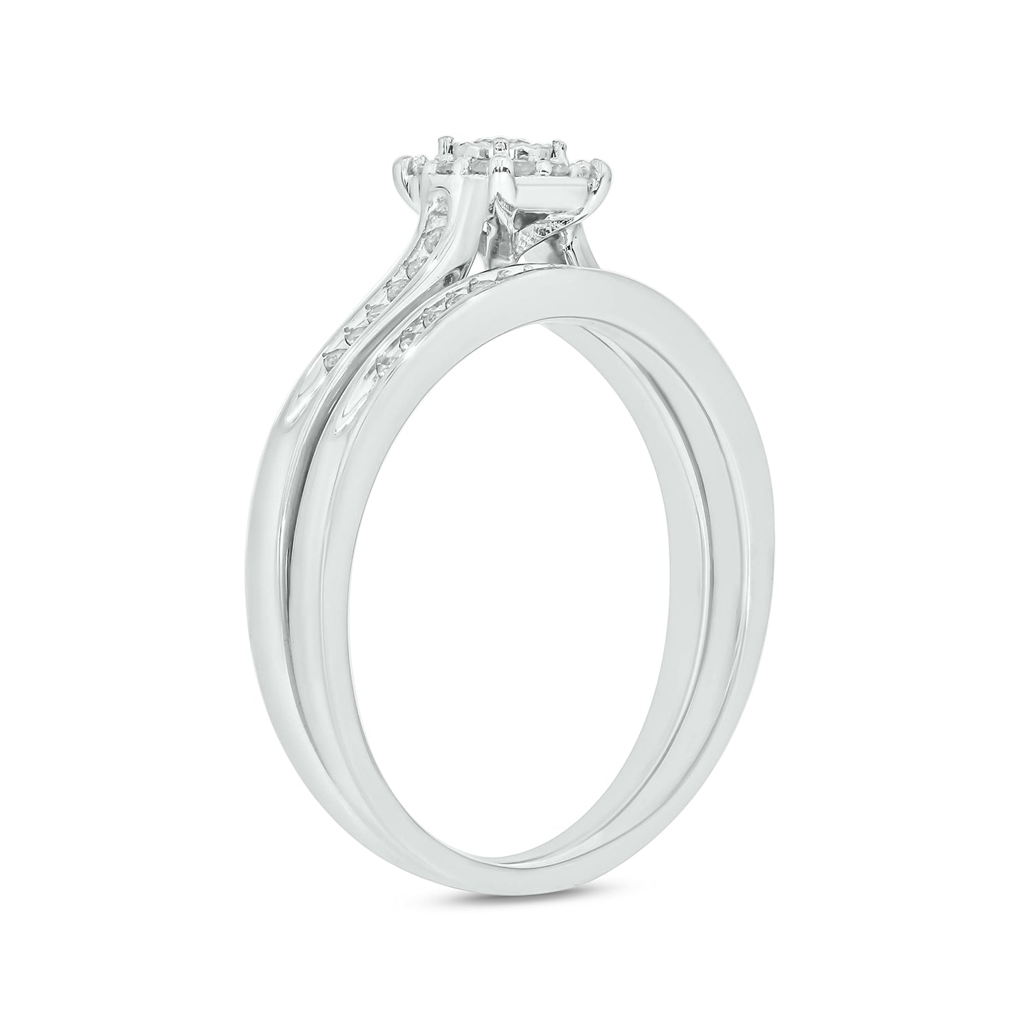 Beautifully crafted in 925 sterling silver, this square halo cluster wedding ring set features 1/4ct natural round diamonds. Seal your love and commitment with our diamond wedding band, the perfect companion to your engagement ring.
