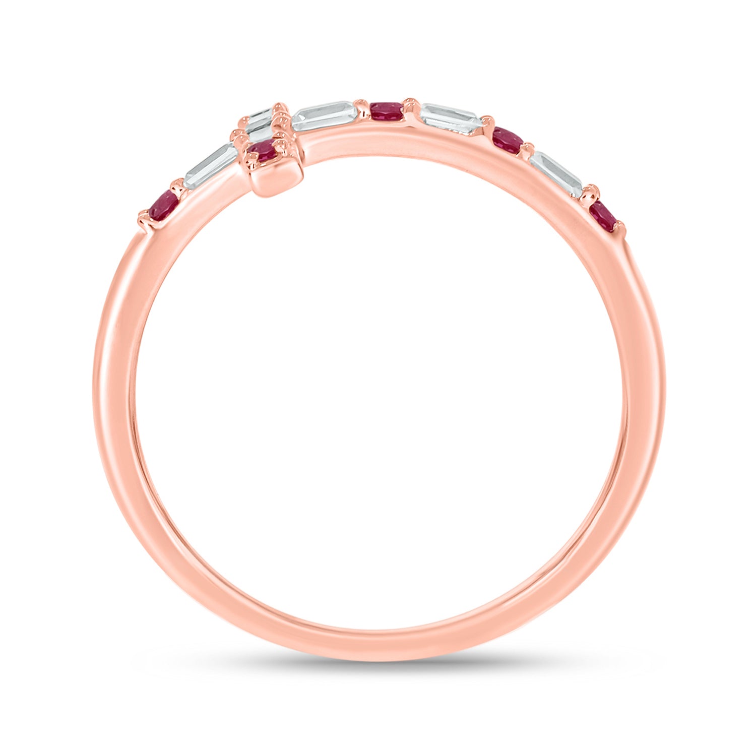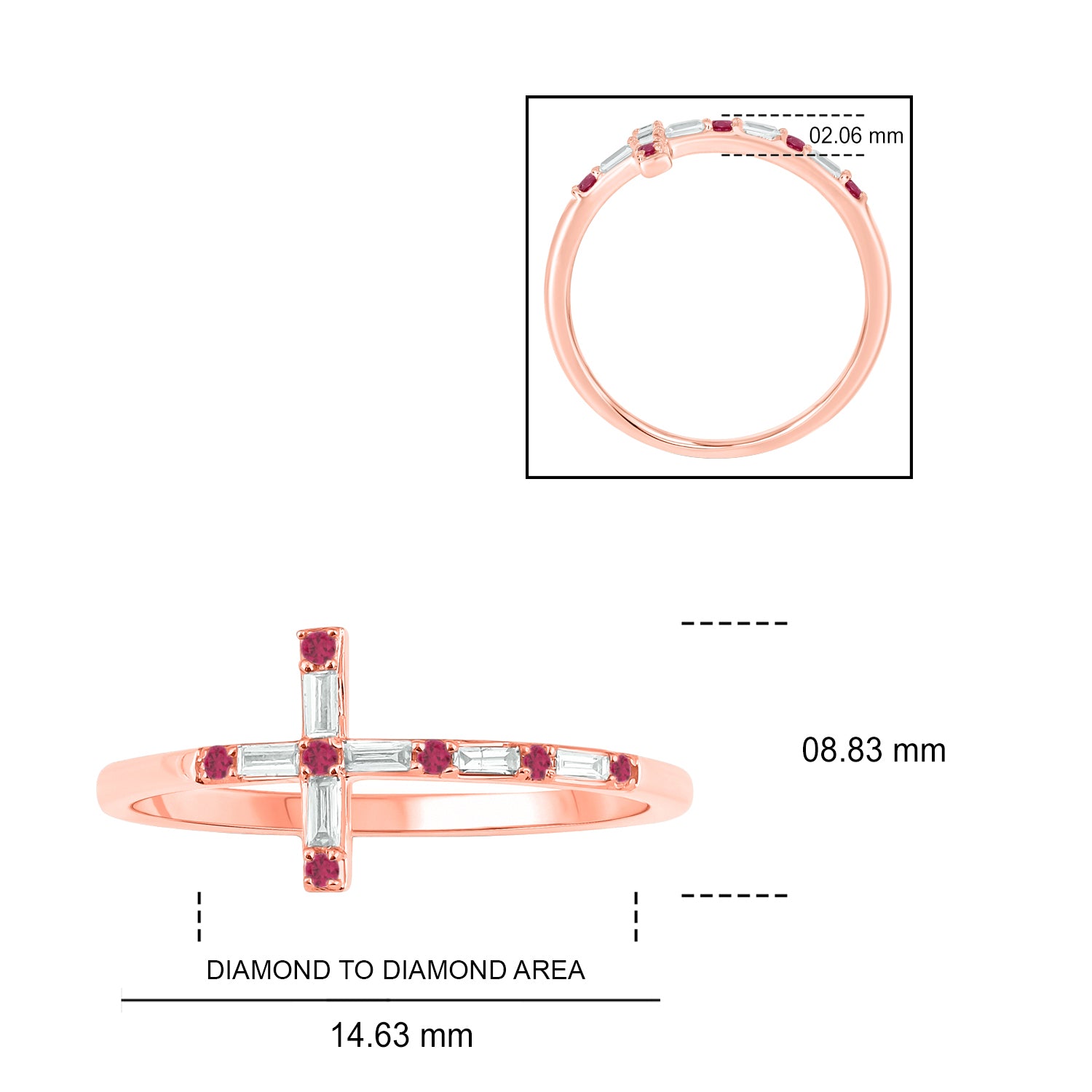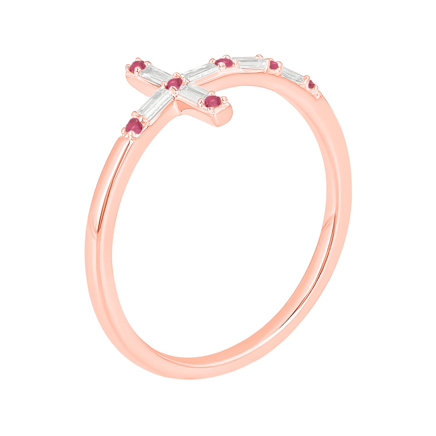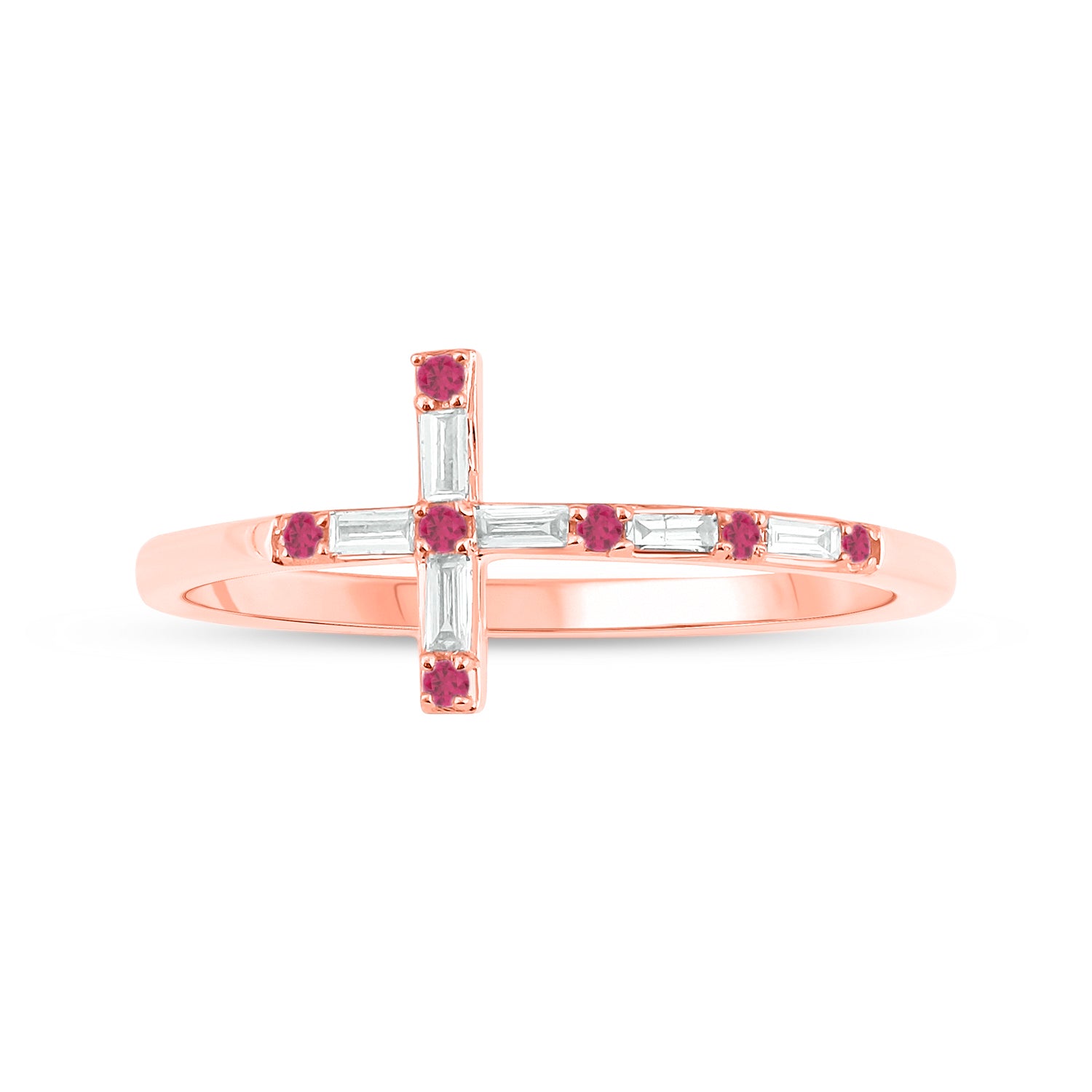 The sign of faith and love, this dainty diamond and gemstone horizontal cross ring is crafted in 14K gold. It features natural gemstones and natural round and baguette diamonds. Choose from - Natural Round Ruby, Blue Sapphire, Emerald, or Diamond stones to alternate with the Baguettes.